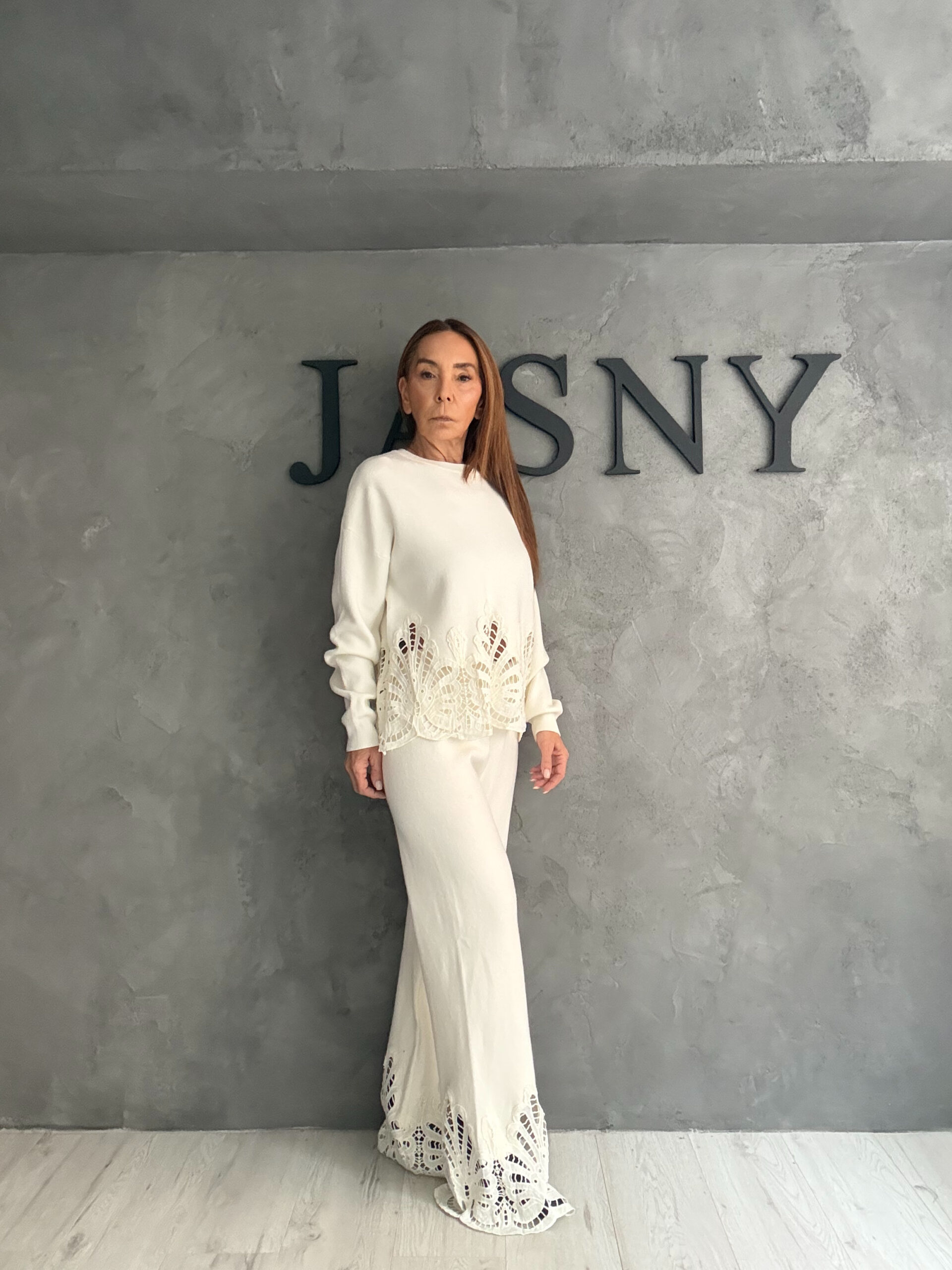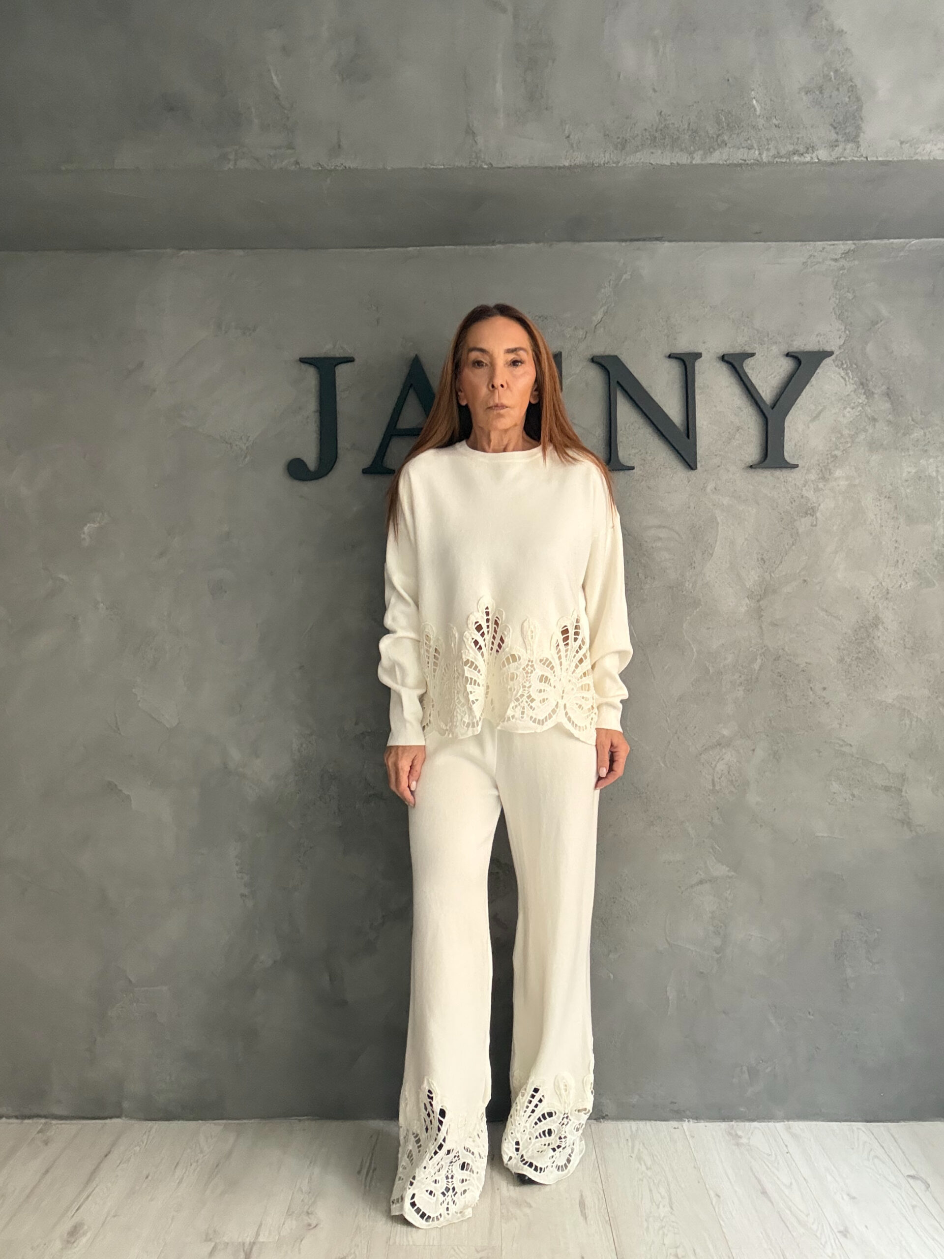 Η άνετη μπλούζα και το παντελόνι ισορροπούν ιδανικά ανάμεσα στη χαλαρή φόρμα και την κομψή αισθητική, ενώ τα διάτρητα τελειώματα προσθέτουν χαρακτήρα χωρίς να βαραίνουν το look.