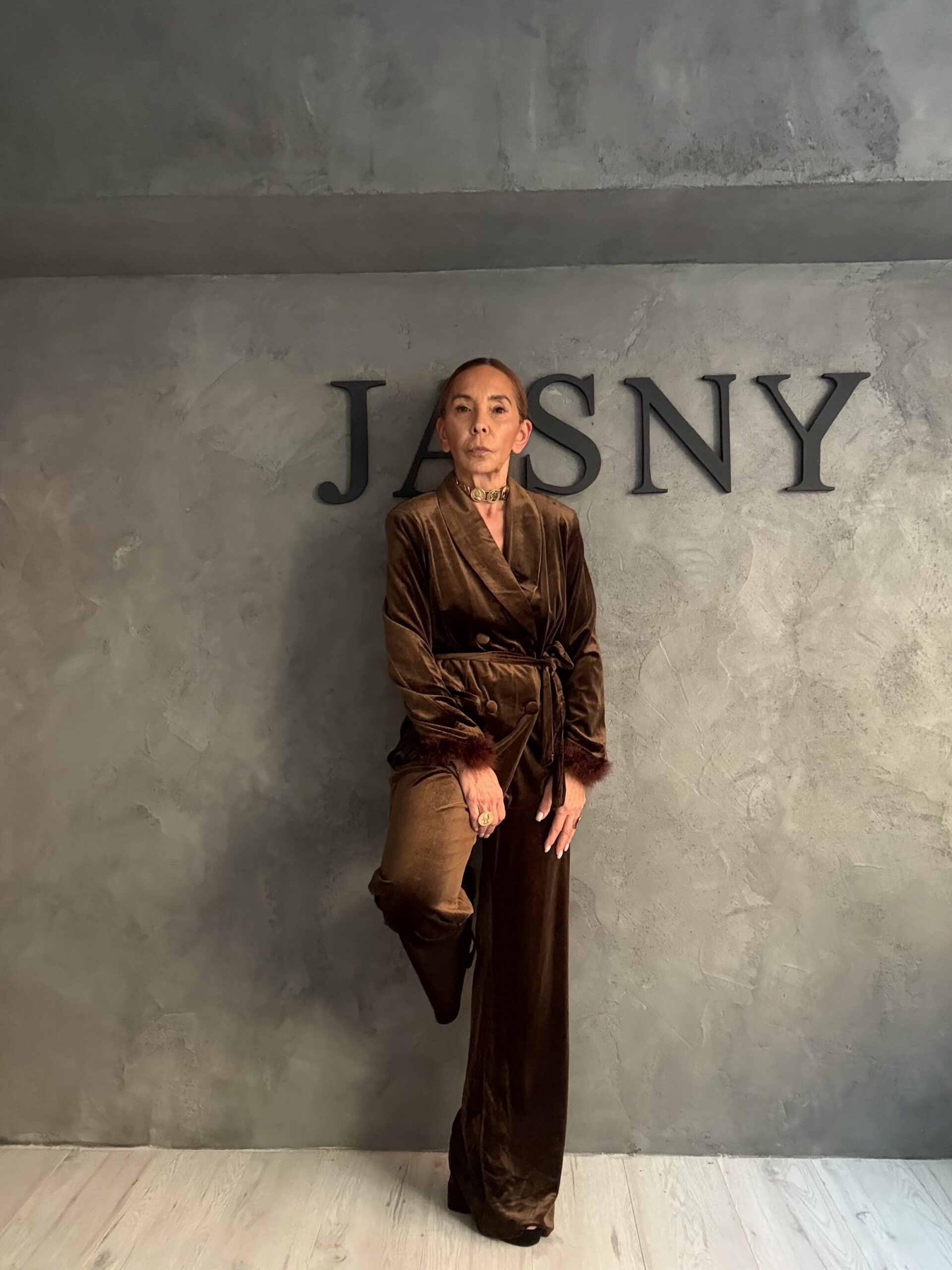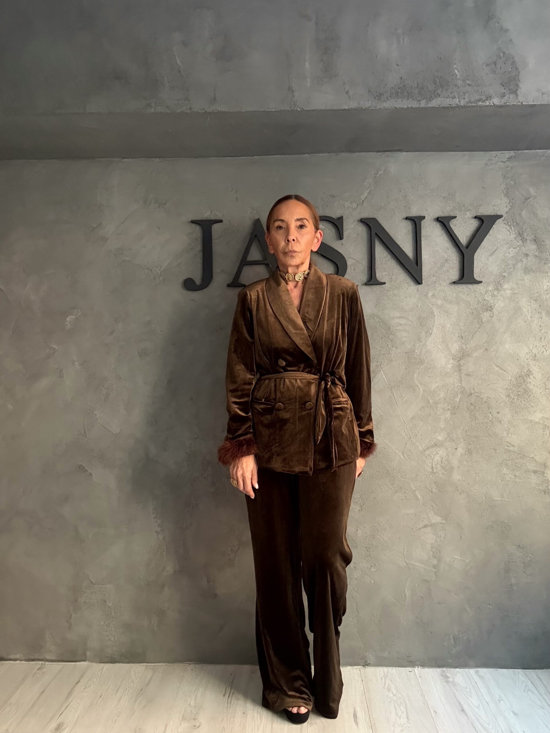 Καφέ σετ από βελούδινη υφή με καθαρές, δυνατές γραμμές και διακριτική λάμψη. Το σακάκι με πέτο, ζώνη στη μέση και χαλαρή εφαρμογή αγκαλιάζει τη σιλουέτα χωρίς να την περιορίζει, ενώ το παντελόνι ολοκληρώνει το σύνολο με κομψή, ρευστή κίνηση.