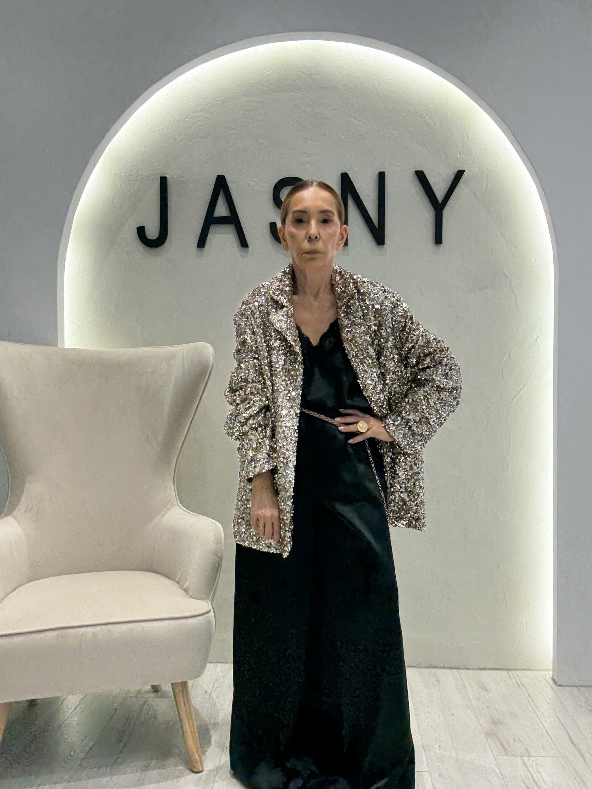 Η σιλουέτα παραμένει καθαρή και δυνατή, αφήνοντας τη λάμψη να ξεχωρίσει χωρίς υπερβολή. Ένα look που αποπνέει αυτοπεποίθηση και σύγχρονη πολυτέλεια — ιδανικό για βραδινές εμφανίσεις και ιδιαίτερες στιγμές.