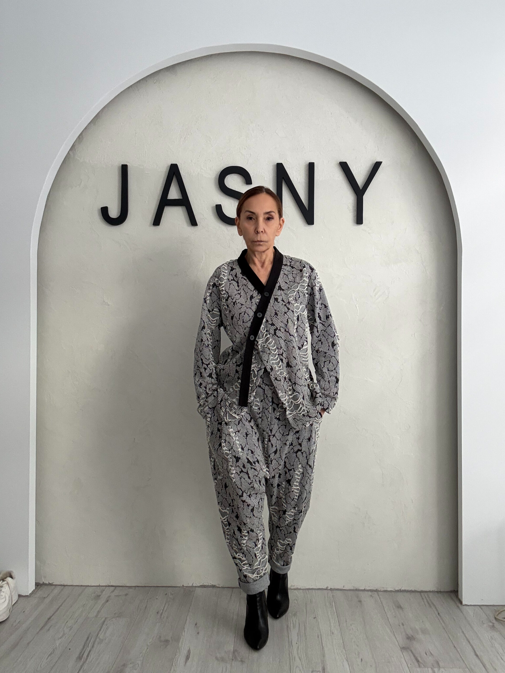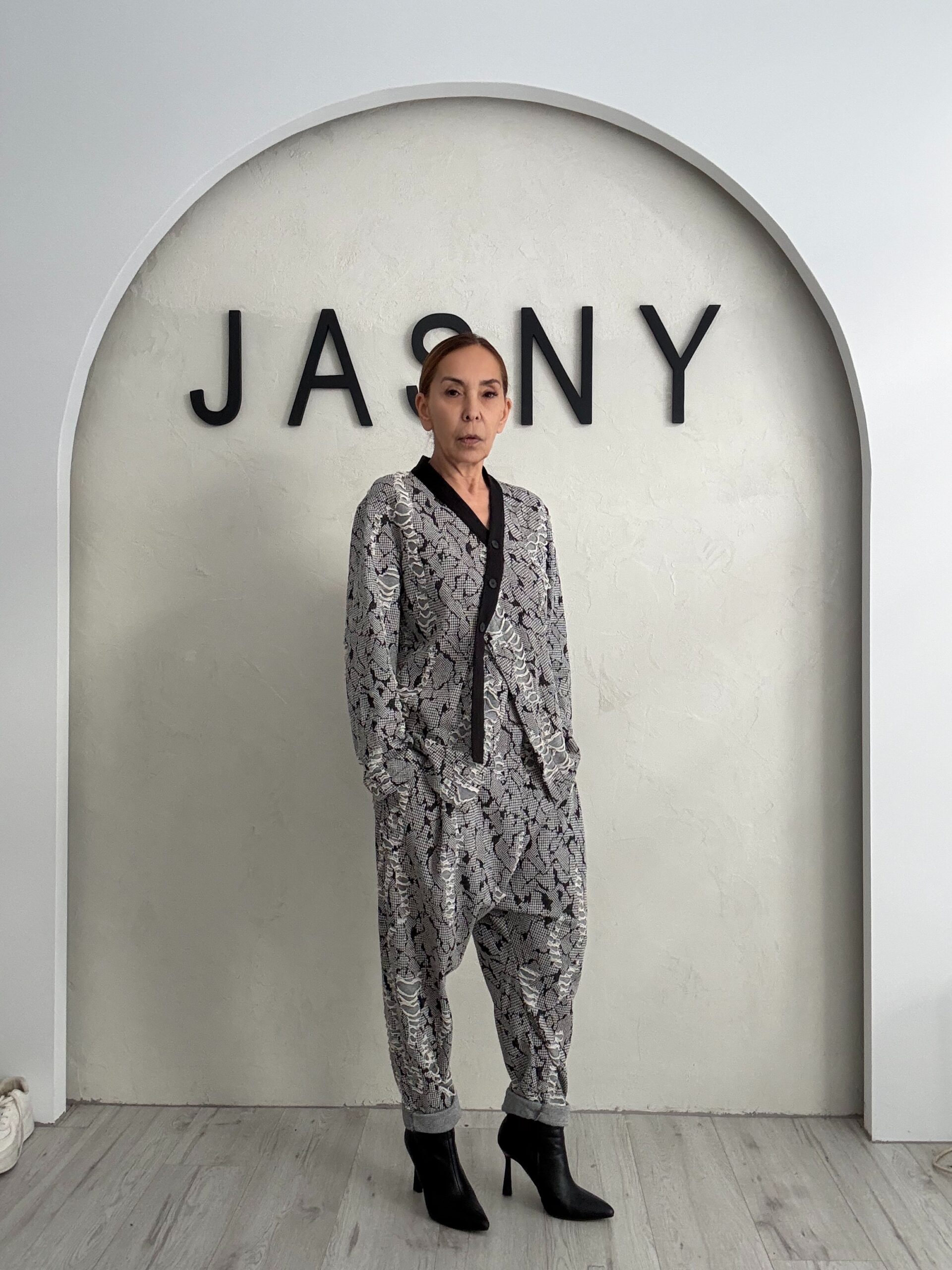 Η μονοχρωματική παλέτα και το ιδιαίτερο pattern δίνουν βάθος στο σύνολο χωρίς υπερβολή, καθιστώντας το ιδανικό για γυναίκες που αγαπούν το statement μέσα από την υφή και όχι από την ένταση.