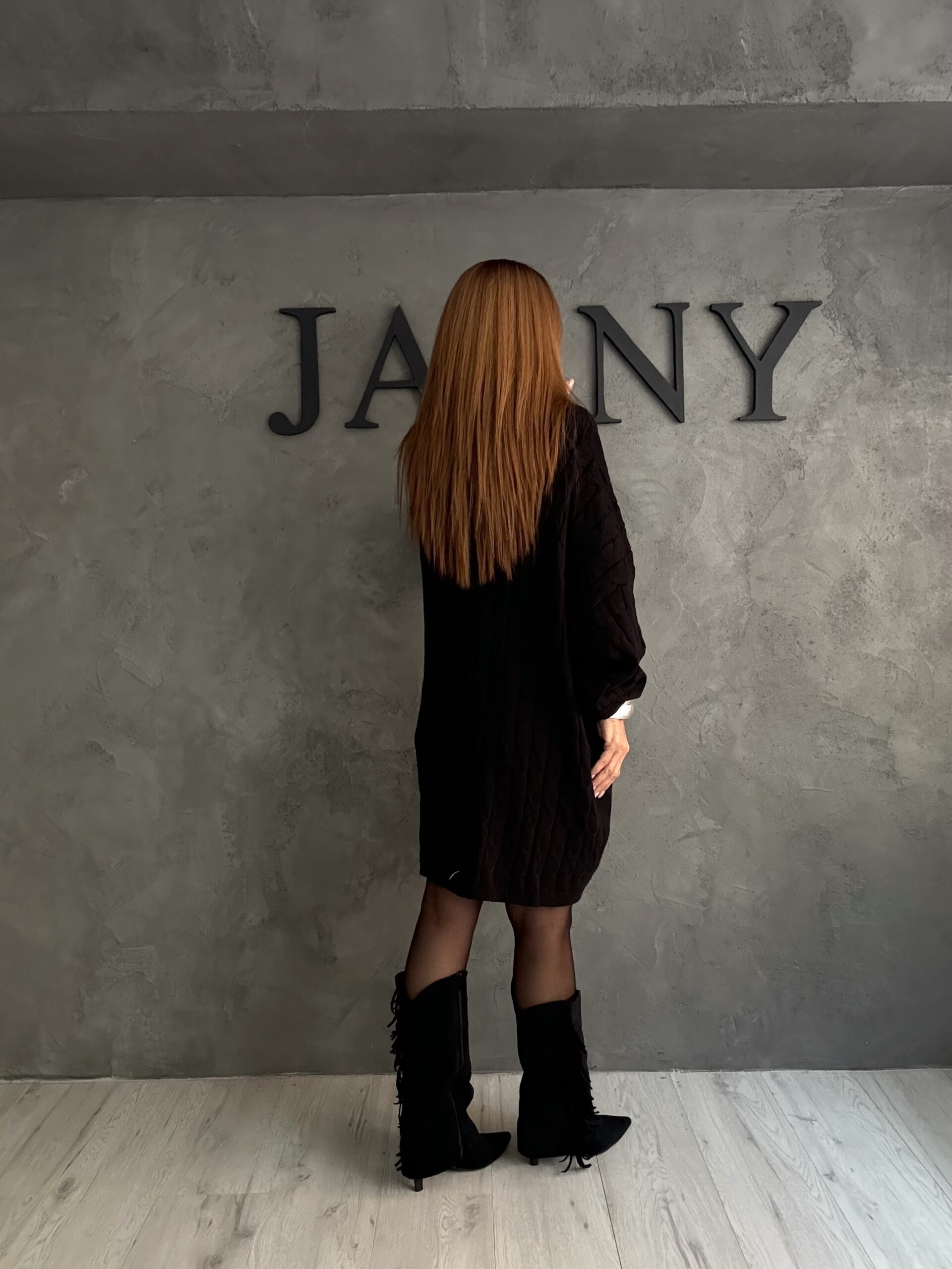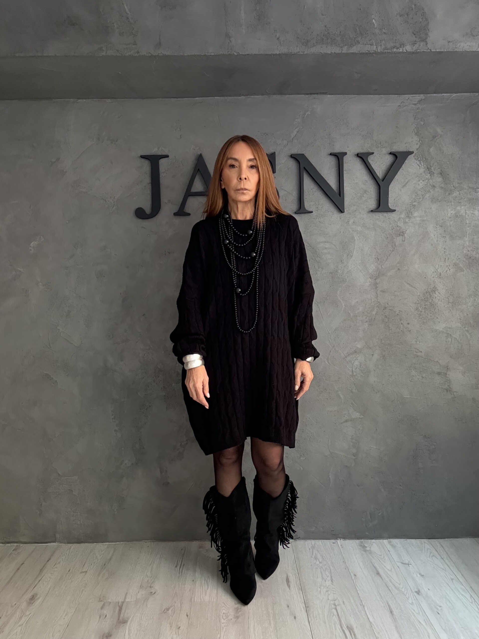 Ένα total black look που αποπνέει δύναμη, ηρεμία και σύγχρονη κομψότητα. Το πλεκτό φόρεμα με χαλαρή, oversized γραμμή δημιουργεί μια καθαρή αλλά δυναμική σιλουέτα, ενώ η κάθετη πλέξη προσθέτει διακριτική υφή και βάθος. Το layering με μακριά κοσμήματα ενισχύει τον χαρακτήρα του look χωρίς να το βαραίνει, διατηρώντας μια refined αισθητική. Ένα σύνολο που βασίζεται στη φόρμα και την υφή, ιδανικό για εμφανίσεις που θέλουν παρουσία χωρίς υπερβολή.