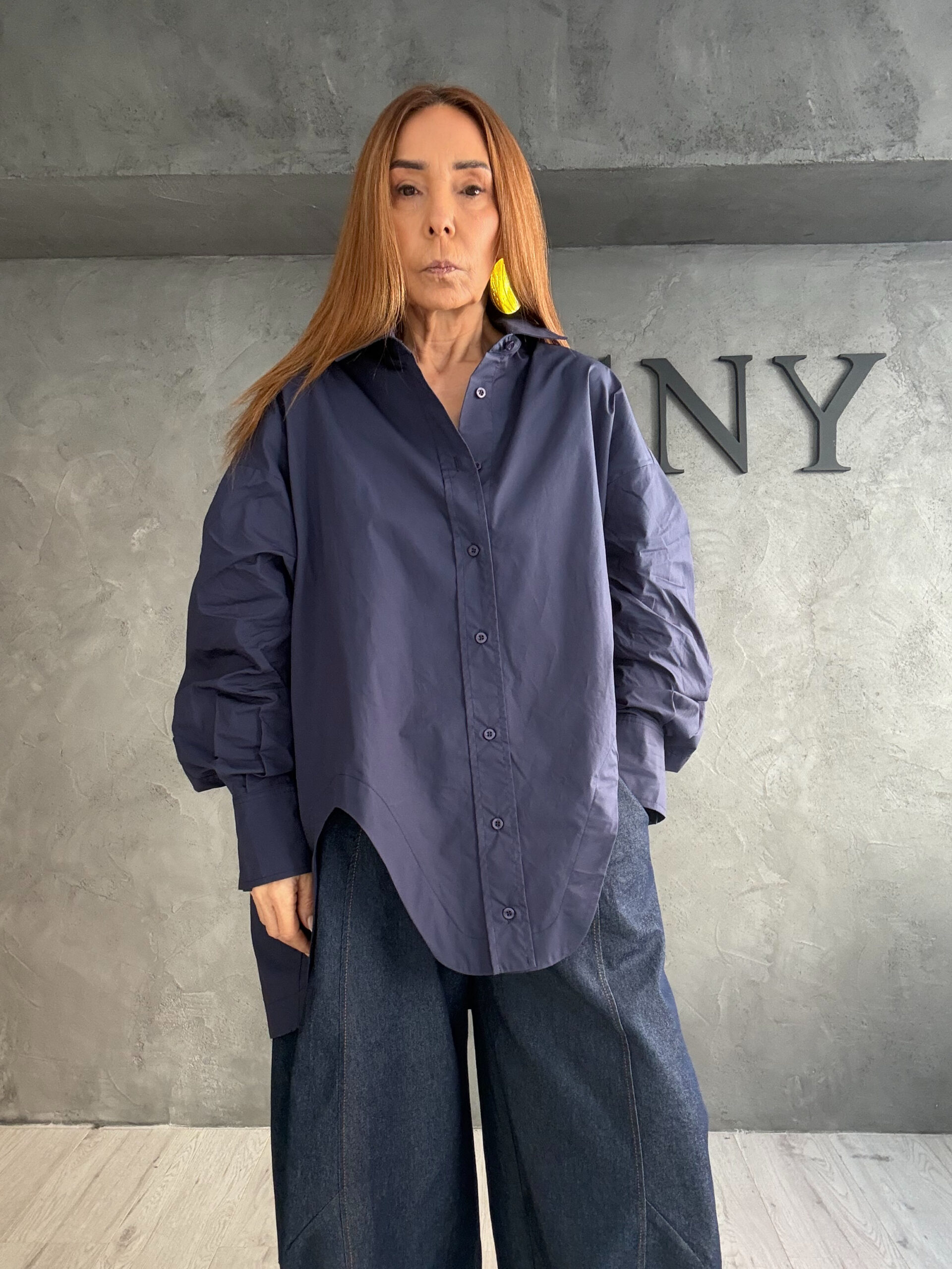Oversized πουκάμισο σε βαθύ μπλε τόνο, με καθαρές γραμμές και δομημένη σιλουέτα. Η άνετη εφαρμογή του και οι έντονες διαστάσεις δημιουργούν ένα σύγχρονο, αρχιτεκτονικό αποτέλεσμα που «στέκεται» στο σώμα χωρίς να αγκαλιάζει. Το σταθερό βαμβακερό ύφασμα προσφέρει αίσθηση ποιότητας και σοβαρότητας, καθιστώντας το ιδανικό για all-day εμφανίσεις με minimal χαρακτήρα. Ένα διαχρονικό κομμάτι που λειτουργεί τόσο μόνο του όσο και σε layered συνδυασμούς.