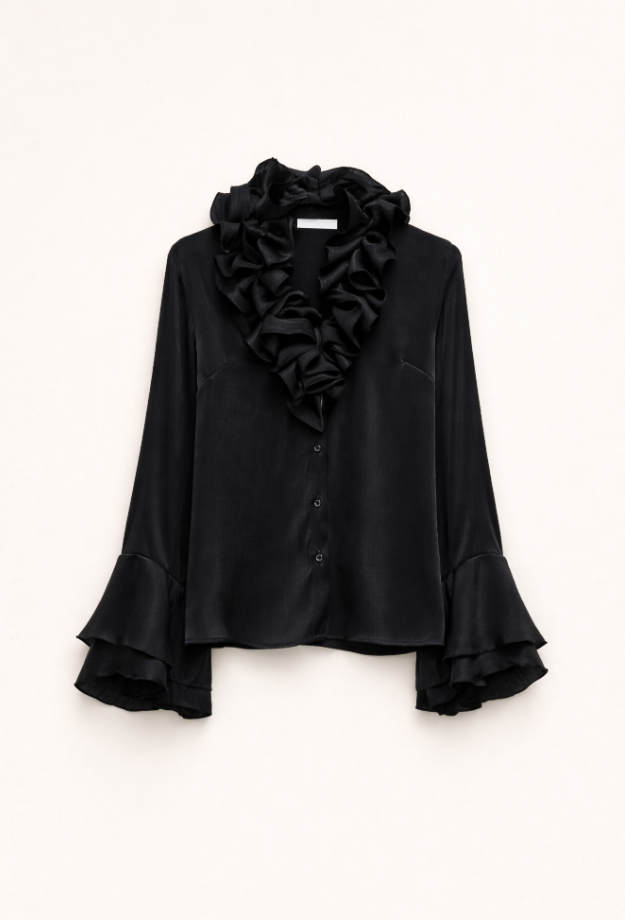 Μαύρο αέρινο πουκάμισο με έντονα βολάν στο μπροστινό μέρος και στα μανίκια, που προσδίδουν κίνηση και θεατρικότητα στο σύνολο. Η ρευστή υφή του υφάσματος αγκαλιάζει το σώμα χωρίς να βαραίνει, ενώ το βαθύ μαύρο χρώμα αναδεικνύει τη δομή του σχεδίου, δημιουργώντας ένα κομμάτι με ισχυρή παρουσία και fashion χαρακτήρα.