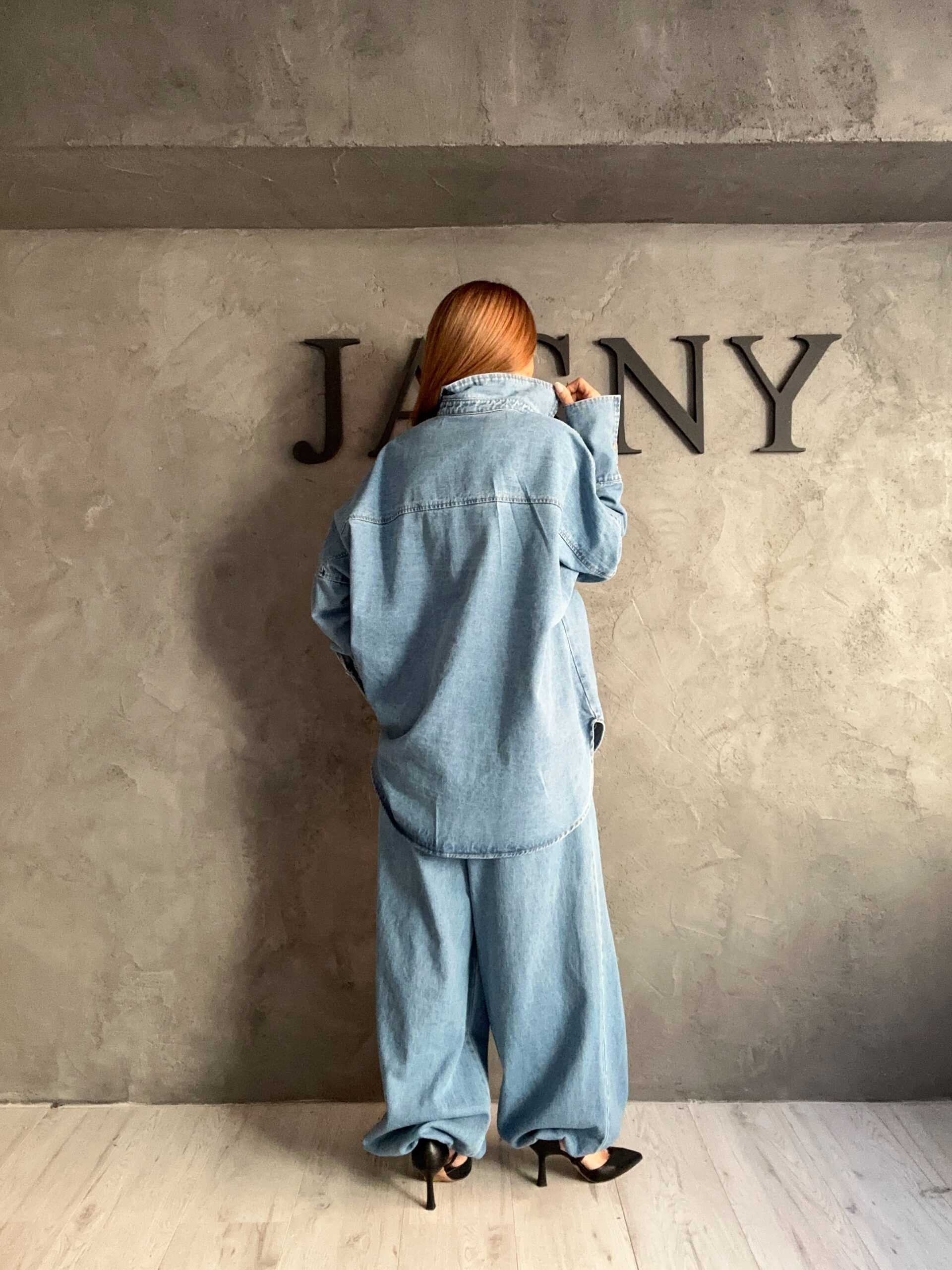 Σετ από denim πουκάμισο με oversized γραμμή και παντελόνι με χαλαρό όγκο και ελαστικό τελείωμα στο κάτω μέρος. Το πουκάμισο λειτουργεί ως ελαφρύ jacket ή standalone κομμάτι, ενώ το παντελόνι προσφέρει άνεση και σύγχρονη σιλουέτα. Ένα denim σύνολο με utility αισθητική, ιδανικό για καθημερινές εμφανίσεις με μοντέρνο, ανεπιτήδευτο ύφος.