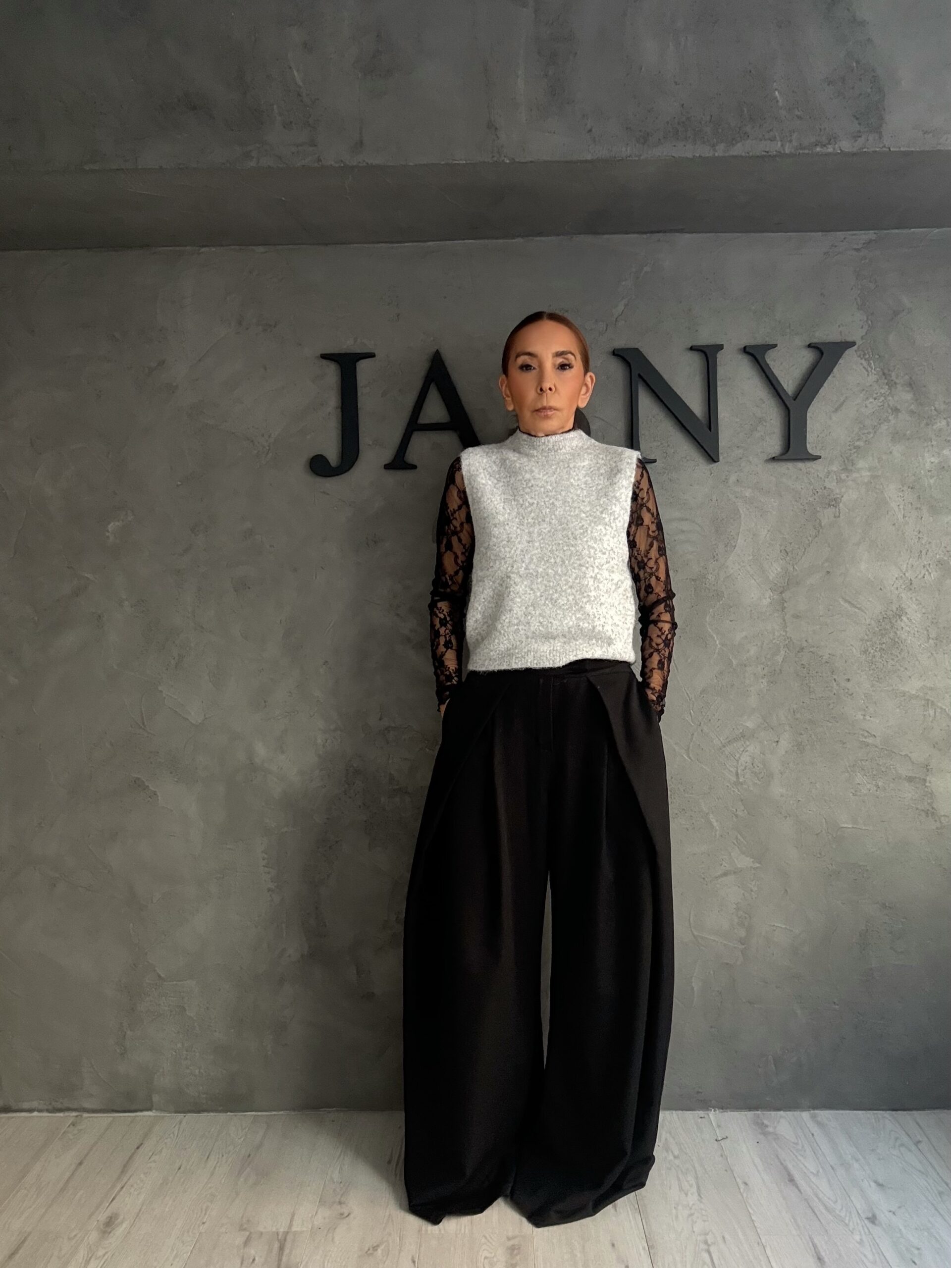 Grey αμάνικο top με απαλή υφή και καθαρή, δομημένη γραμμή που φέρνει ισορροπία και φωτεινότητα στο look. Συνδυασμένο με μαύρο δαντελένιο top από μέσα, δημιουργεί ένα ενδιαφέρον layering με υφές που “δένουν” διακριτικά μεταξύ τους. Η μαύρη ultra-wide παντελόνα προσθέτει όγκο και κίνηση και χαρακτηρίζει το minimal DNA της JASNY. Ένα σύνολο απλό, αλλά ταυτόχρονα statement.