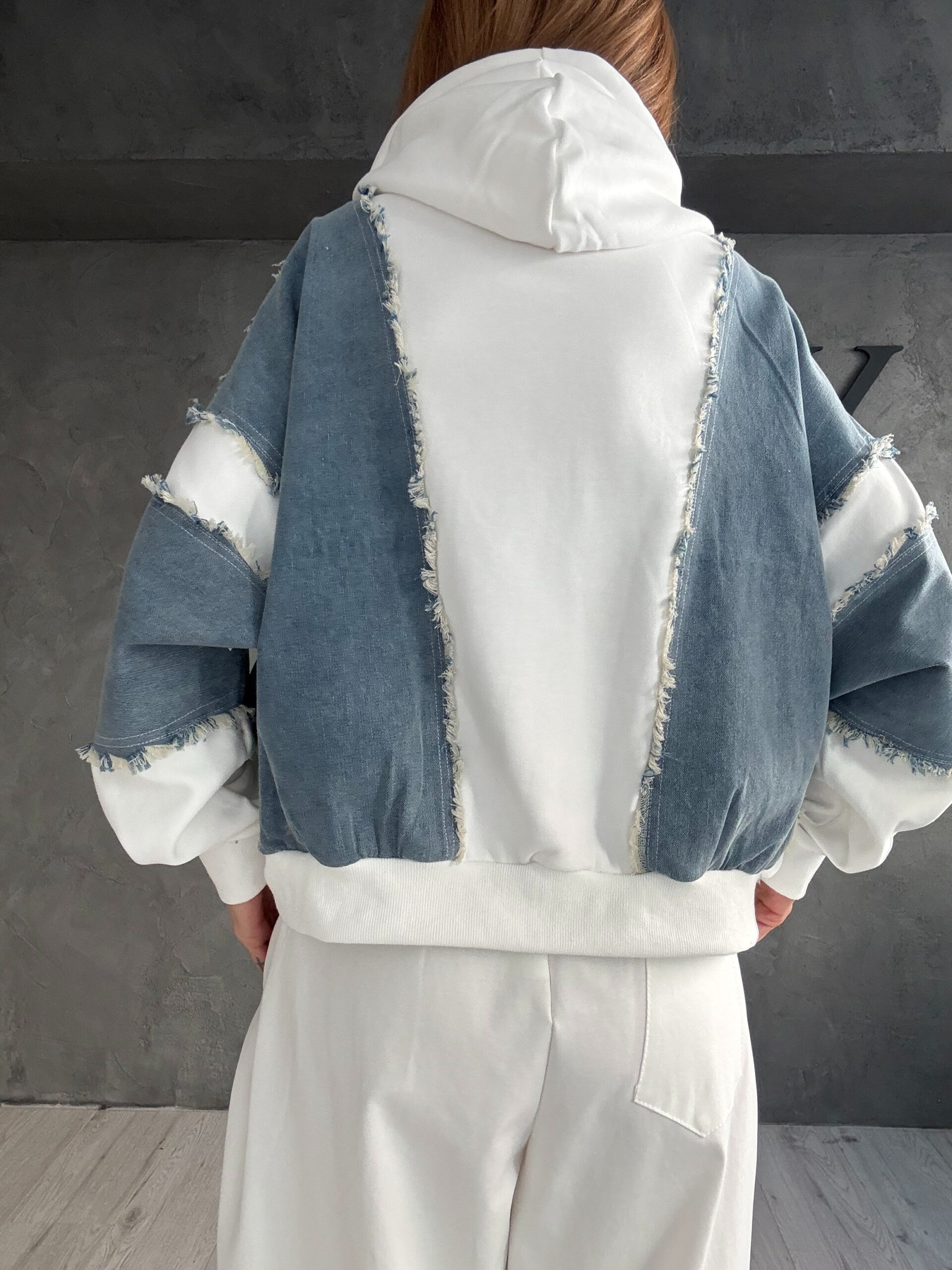 Ζακέτα–hoodie με αποδομημένο χαρακτήρα, που συνδυάζει λευκή βαμβακερή βάση με denim panels και ανεπεξέργαστες ραφές. Οι raw λεπτομέρειες και το patchwork αποτέλεσμα δίνουν ένταση και fashion attitude, ενώ η άνετη γραμμή και η κουκούλα κρατούν το κομμάτι σύγχρονο και φορέσιμο. Ένα statement item με urban και avant-garde αισθητική.