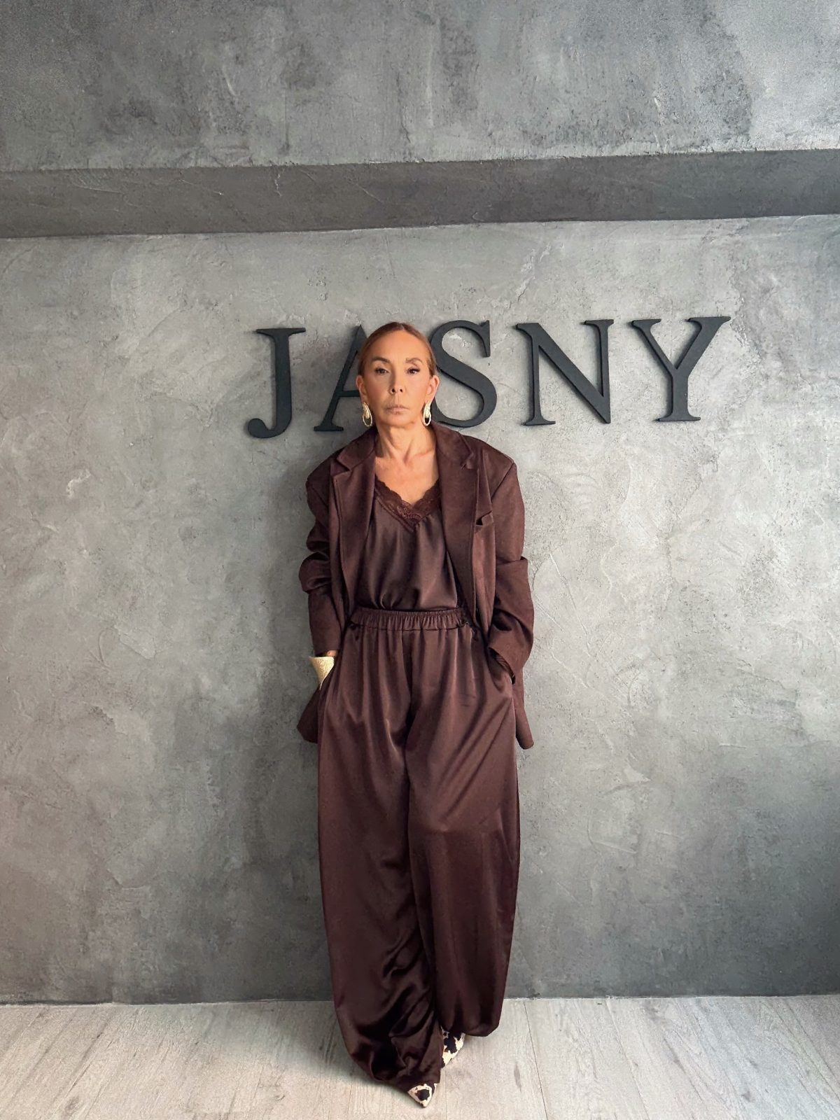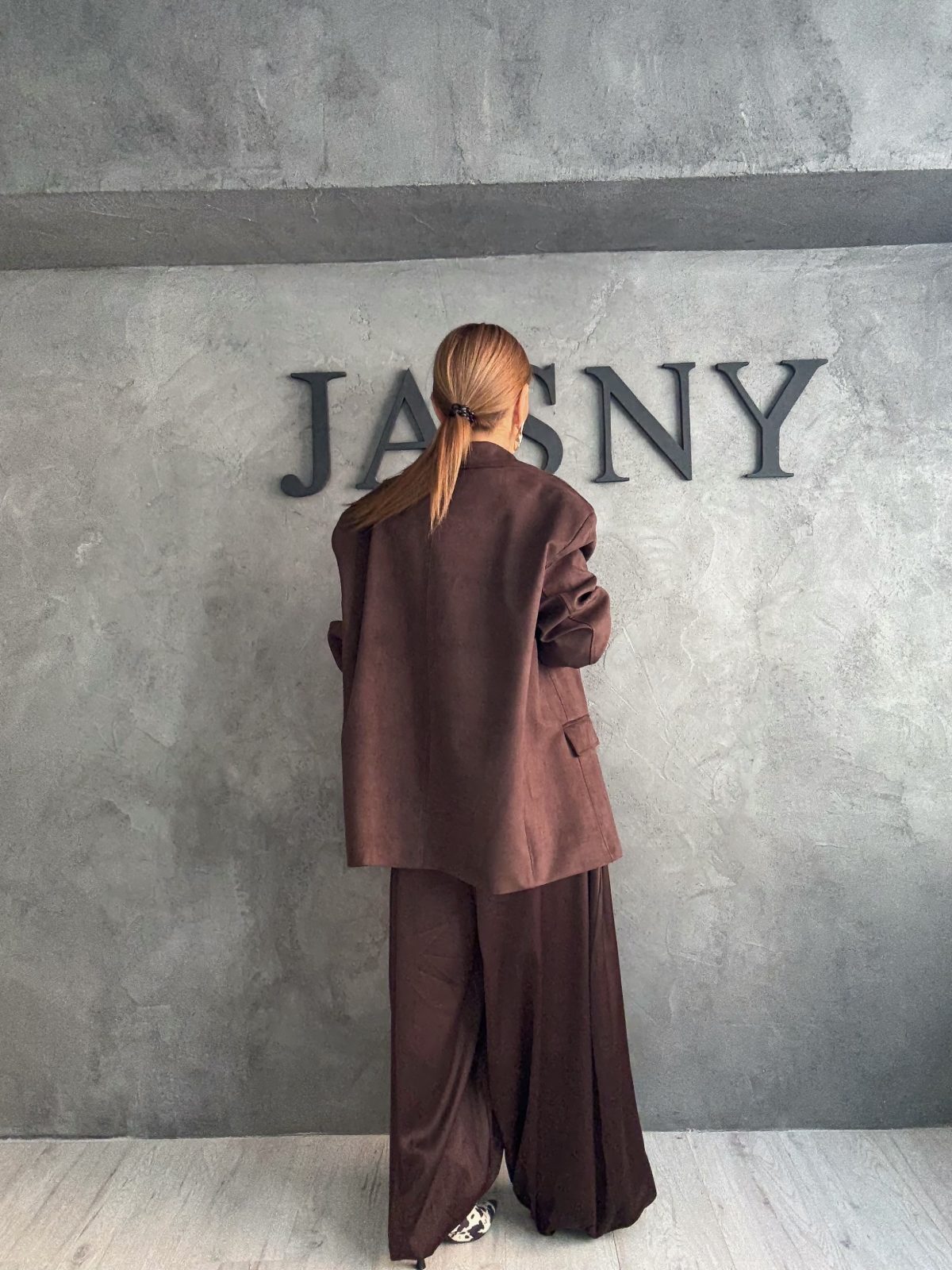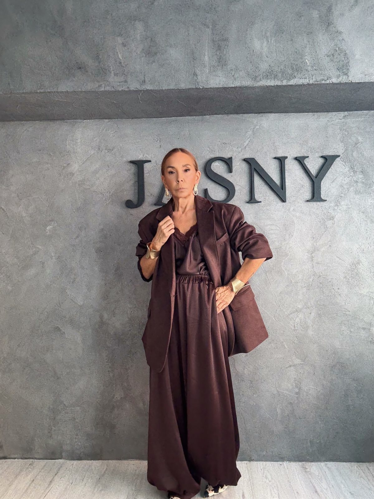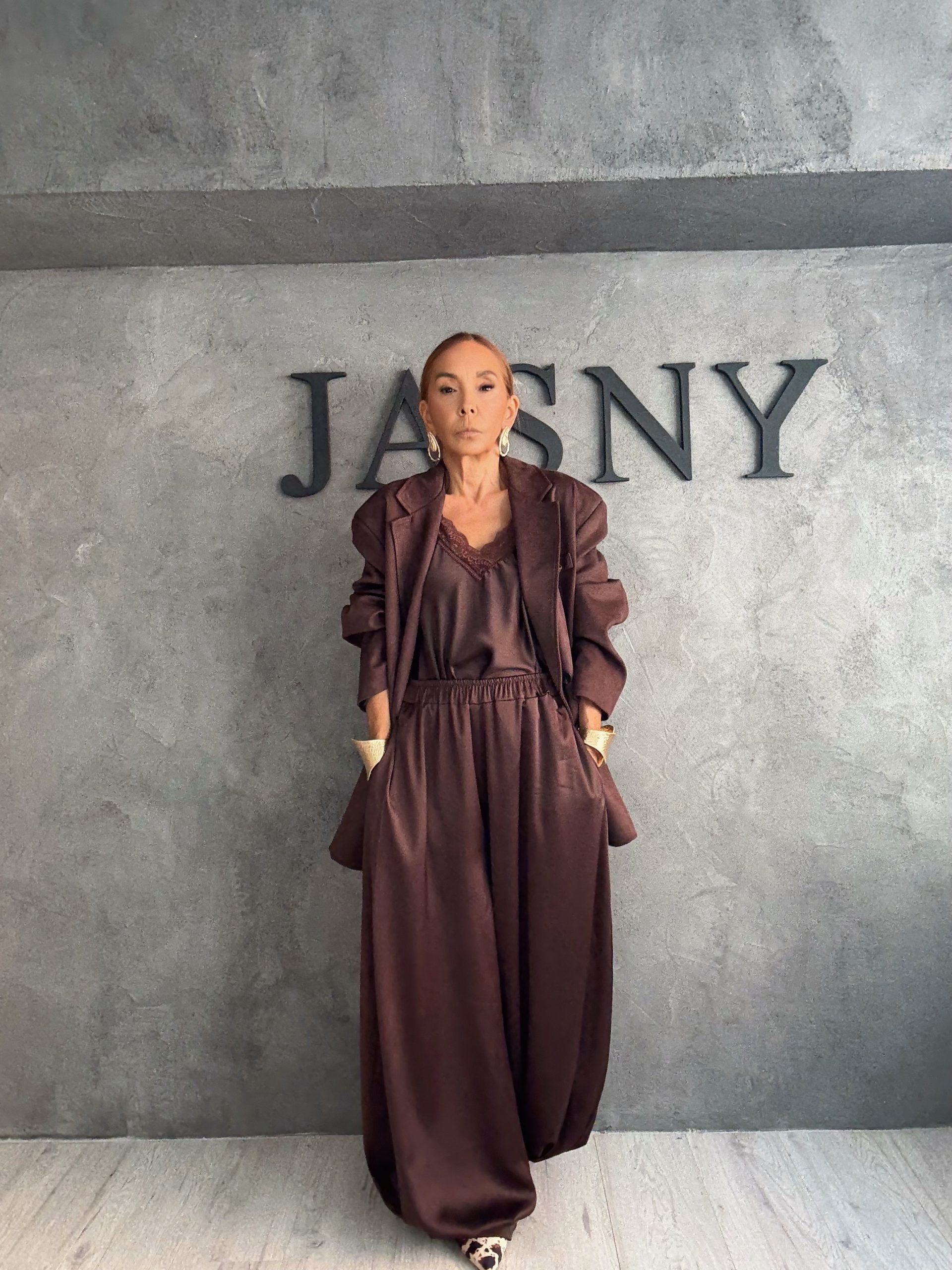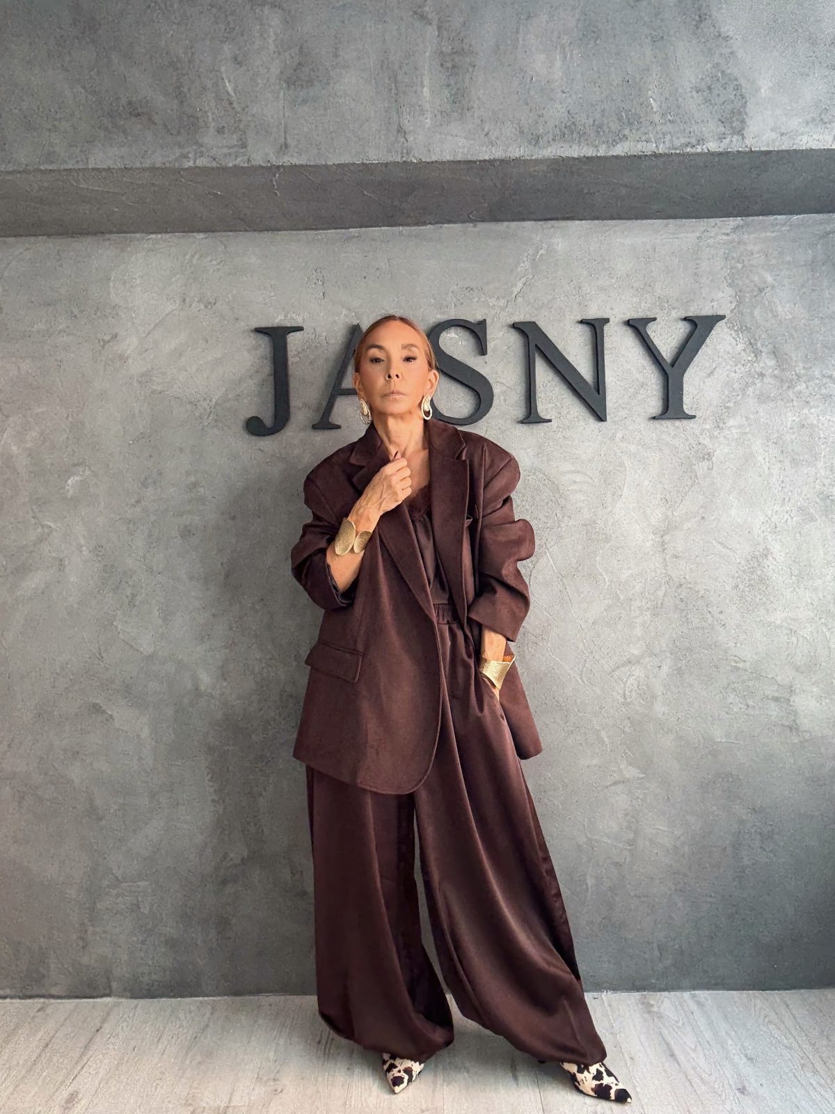 Ένα total brown σύνολο που αποπνέει κομψότητα και αυτοπεποίθηση. Το oversize σακάκι συνδυάζεται με wide-leg παντελόνι σε ίδια απόχρωση, δημιουργώντας μια επιβλητική σιλουέτα με άνεση και ροή. Το σετ ισορροπεί ανάμεσα στη δυναμική ανδρόγυνη αισθητική και τη χαλαρή κομψότητα, ενώ οι λεπτομέρειες στα αξεσουάρ (statement σκουλαρίκια, φαρδύ βραχιόλι) ολοκληρώνουν την εικόνα με minimal πολυτέλεια.