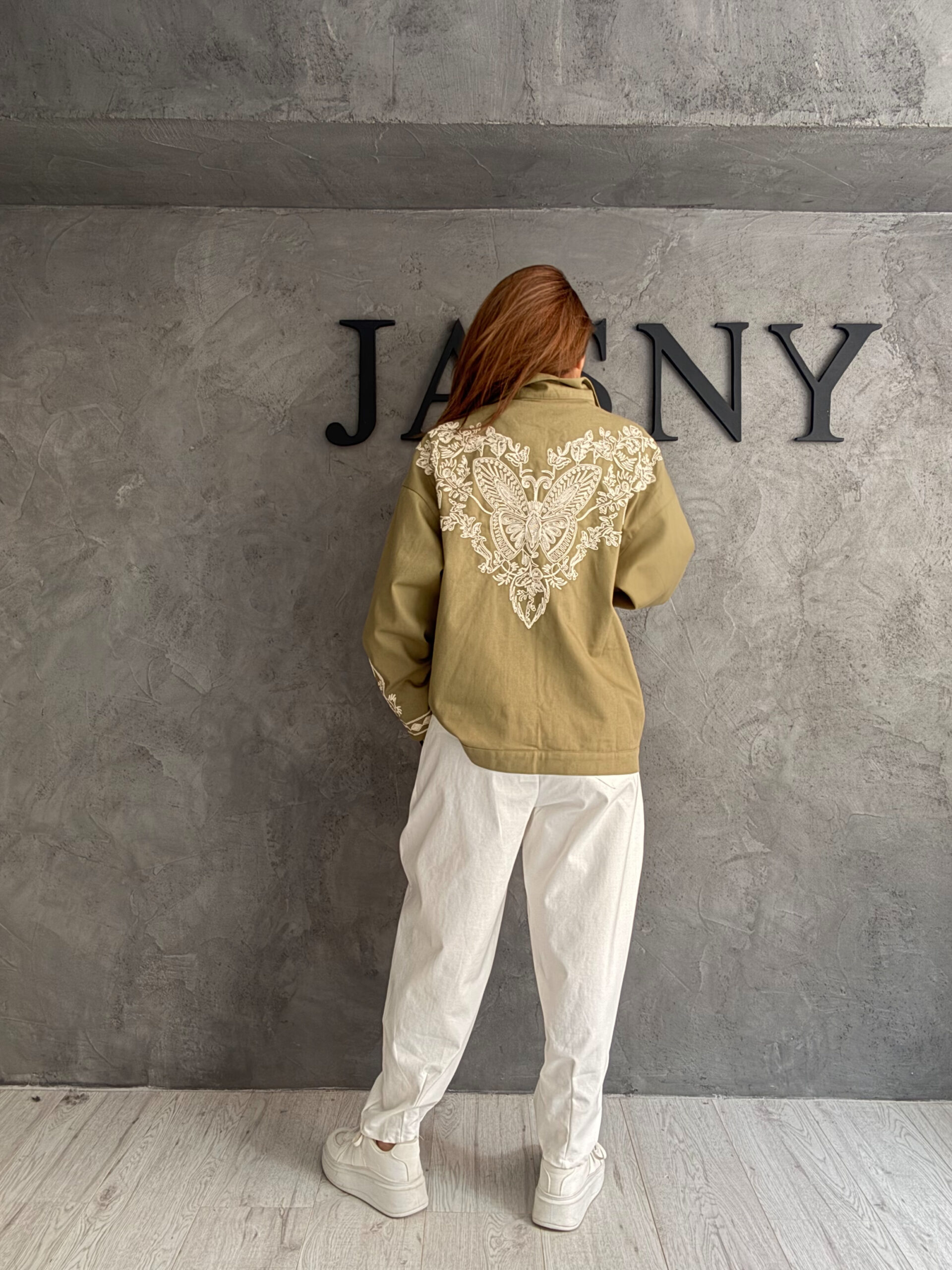 Το εκρού παντελόνι, σε άνετη και καθαρή γραμμή, εξισορροπεί το σύνολο με φως και απλότητα, δημιουργώντας αντίθεση με το χακί και αναδεικνύοντας τη δομή του outfit. Οι ουδέτεροι τόνοι συνεργάζονται αρμονικά, προσφέροντας ένα αποτέλεσμα που είναι διαχρονικό αλλά ταυτόχρονα μοντέρνο. Το look αποπνέει μια αίσθηση ηρεμίας, δύναμης και αυτοπεποίθησης, ιδανικό για γυναίκες που αγαπούν τις oversized φόρμες και τη minimal αισθητική με χαρακτήρα.