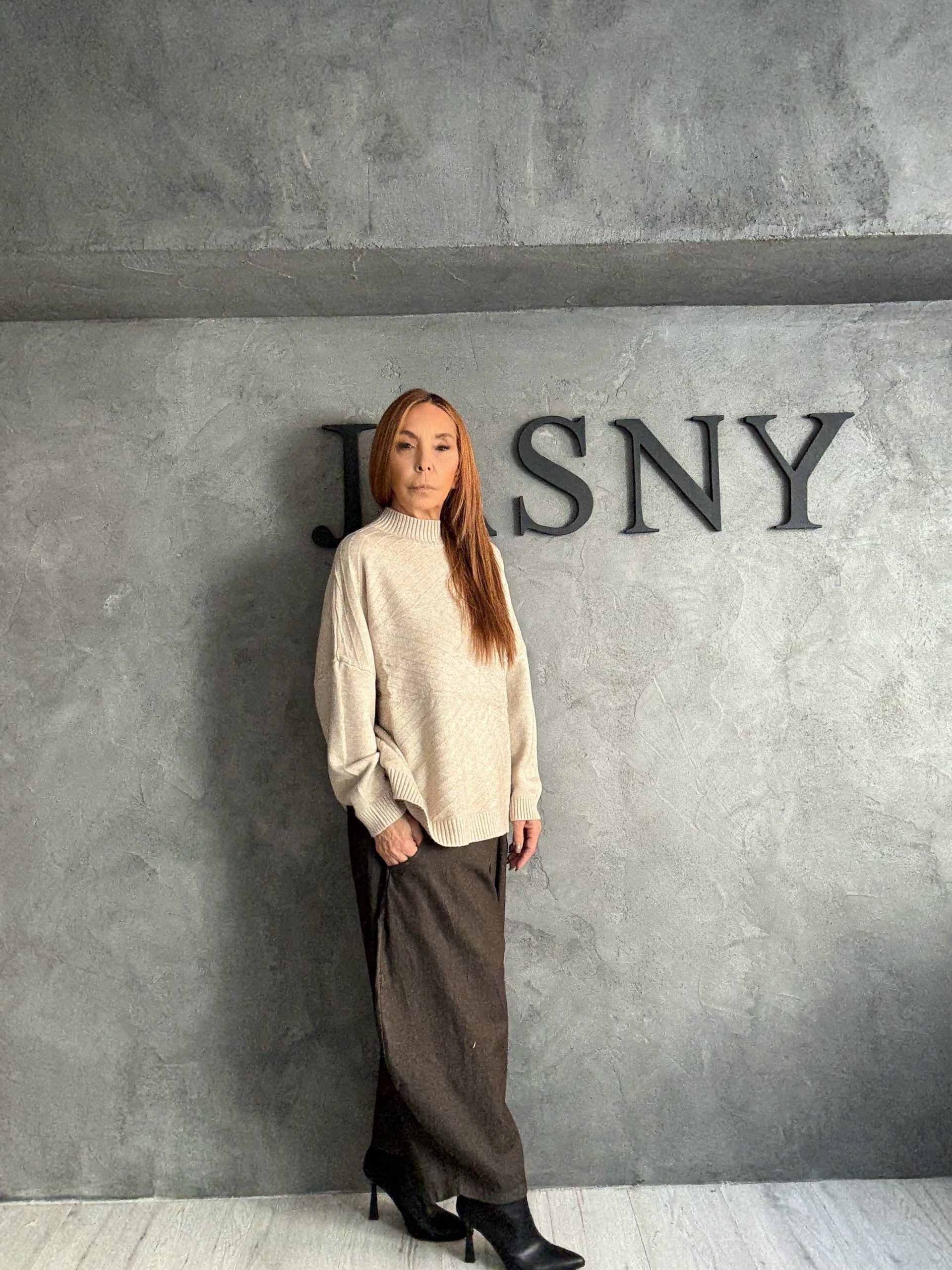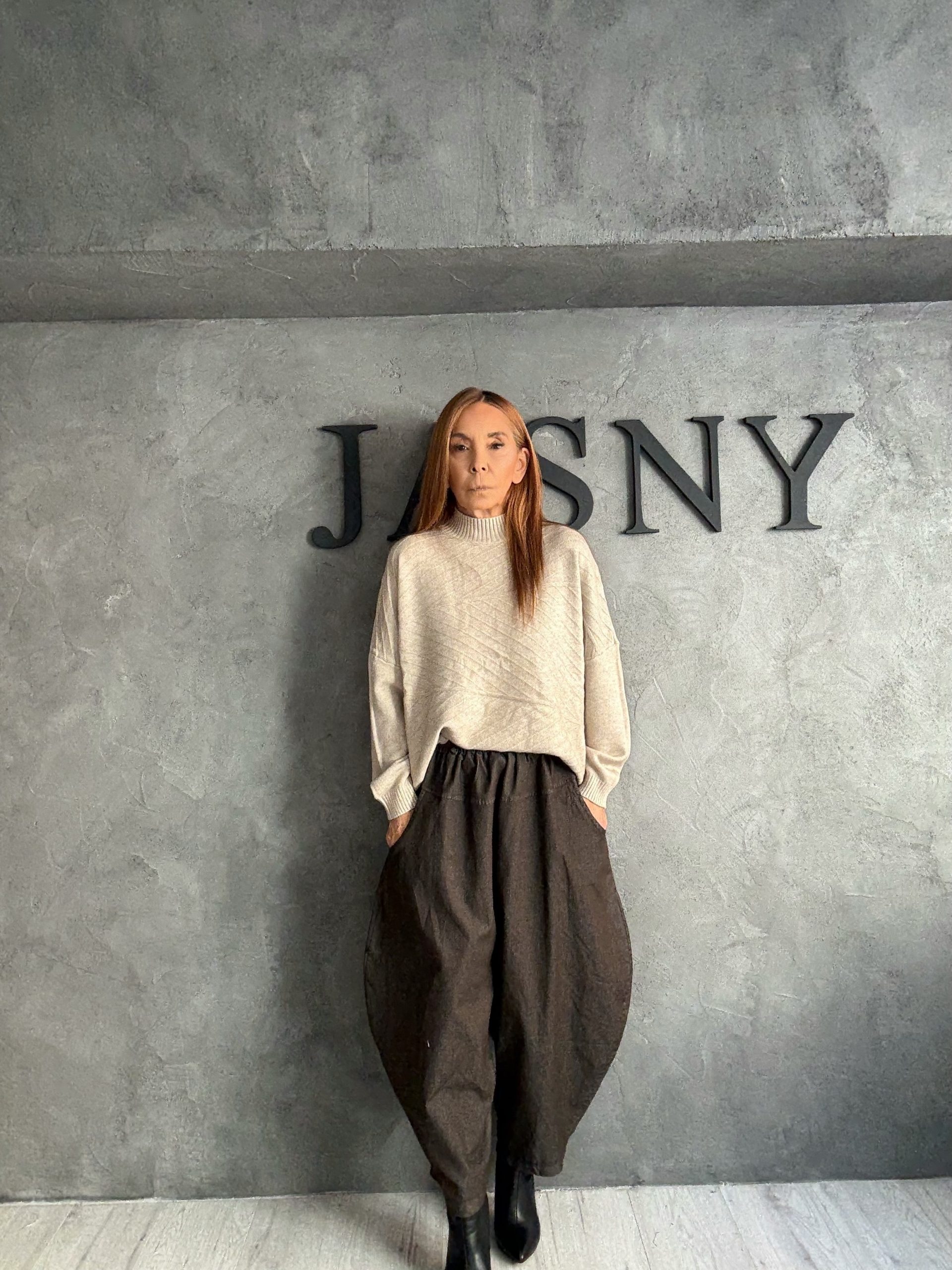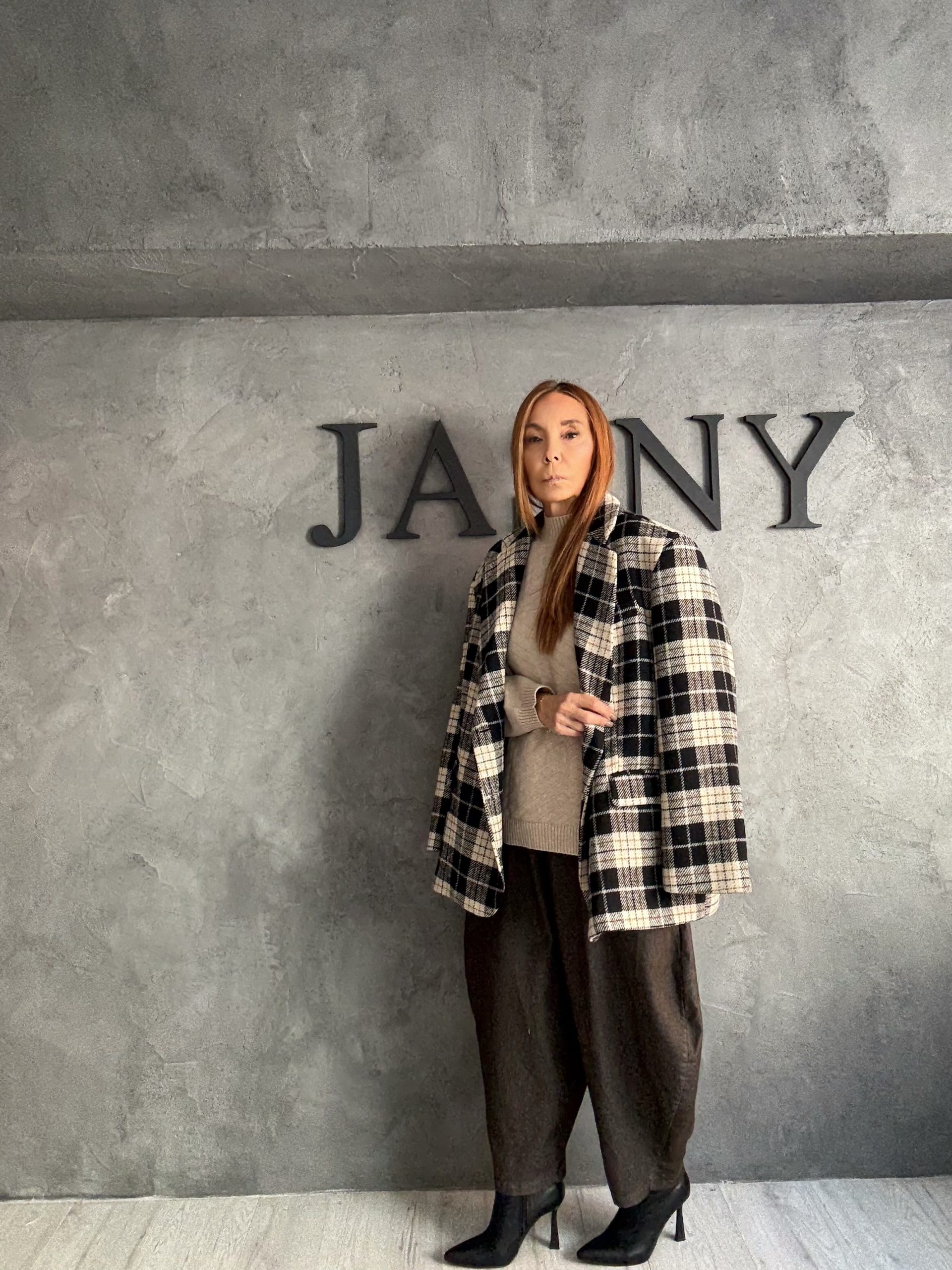 Ένα look που ισορροπεί ανάμεσα στο cozy minimal και το urban fashion. Το oversized πλεκτό σε απαλό μπεζ συνδυάζεται ιδανικά με το balloon παντελόνι σε σκούρα σοκολατί απόχρωση, δημιουργώντας χαλαρή αλλά προσεγμένη σιλουέτα. Το statement καρό σακάκι ολοκληρώνει το σύνολο, χαρίζοντας ένταση και μοντέρνα διάθεση. Ένα δυνατό outfit για γυναίκες με άποψη και αστική αισθητική.