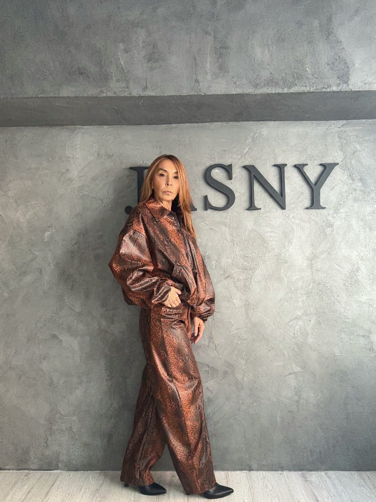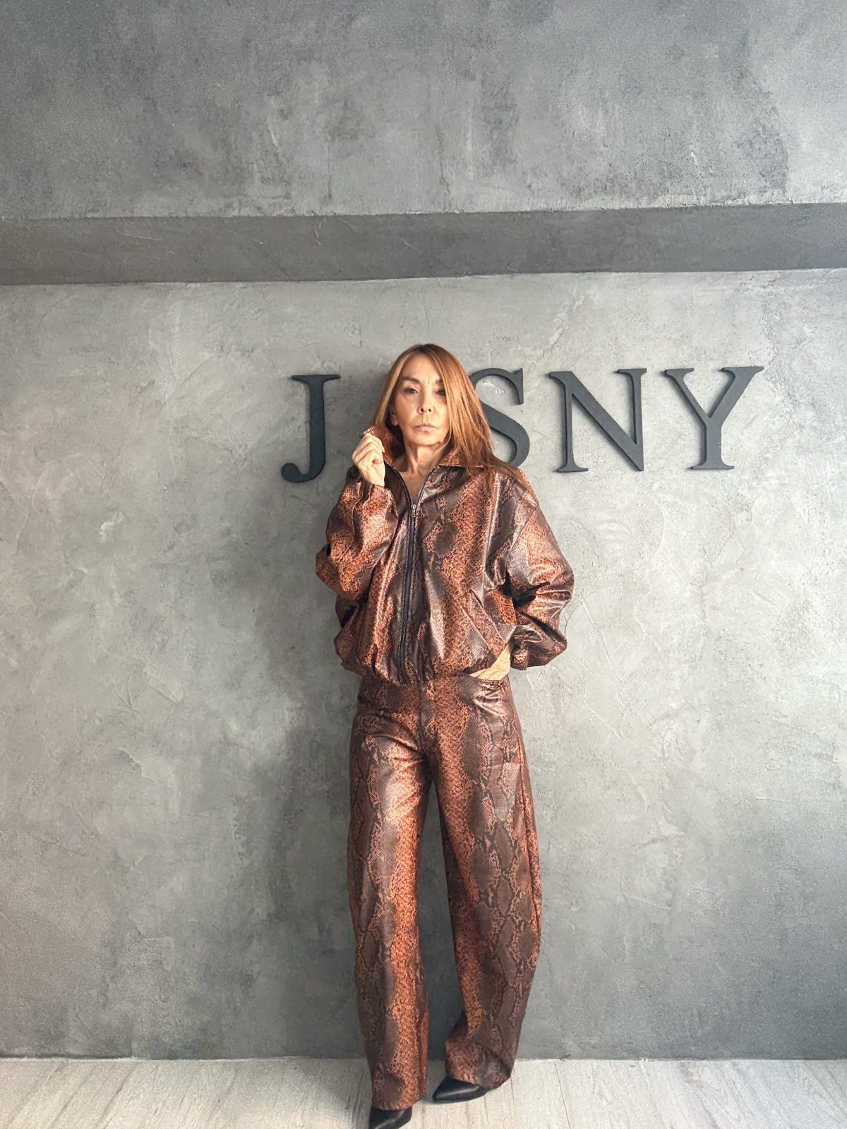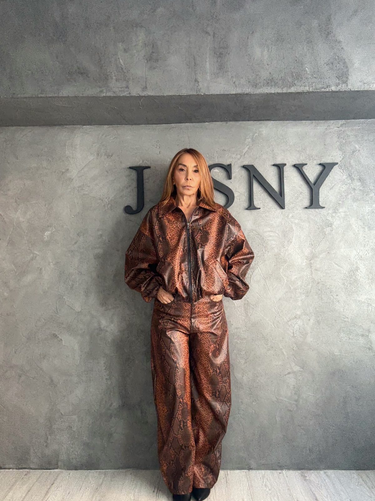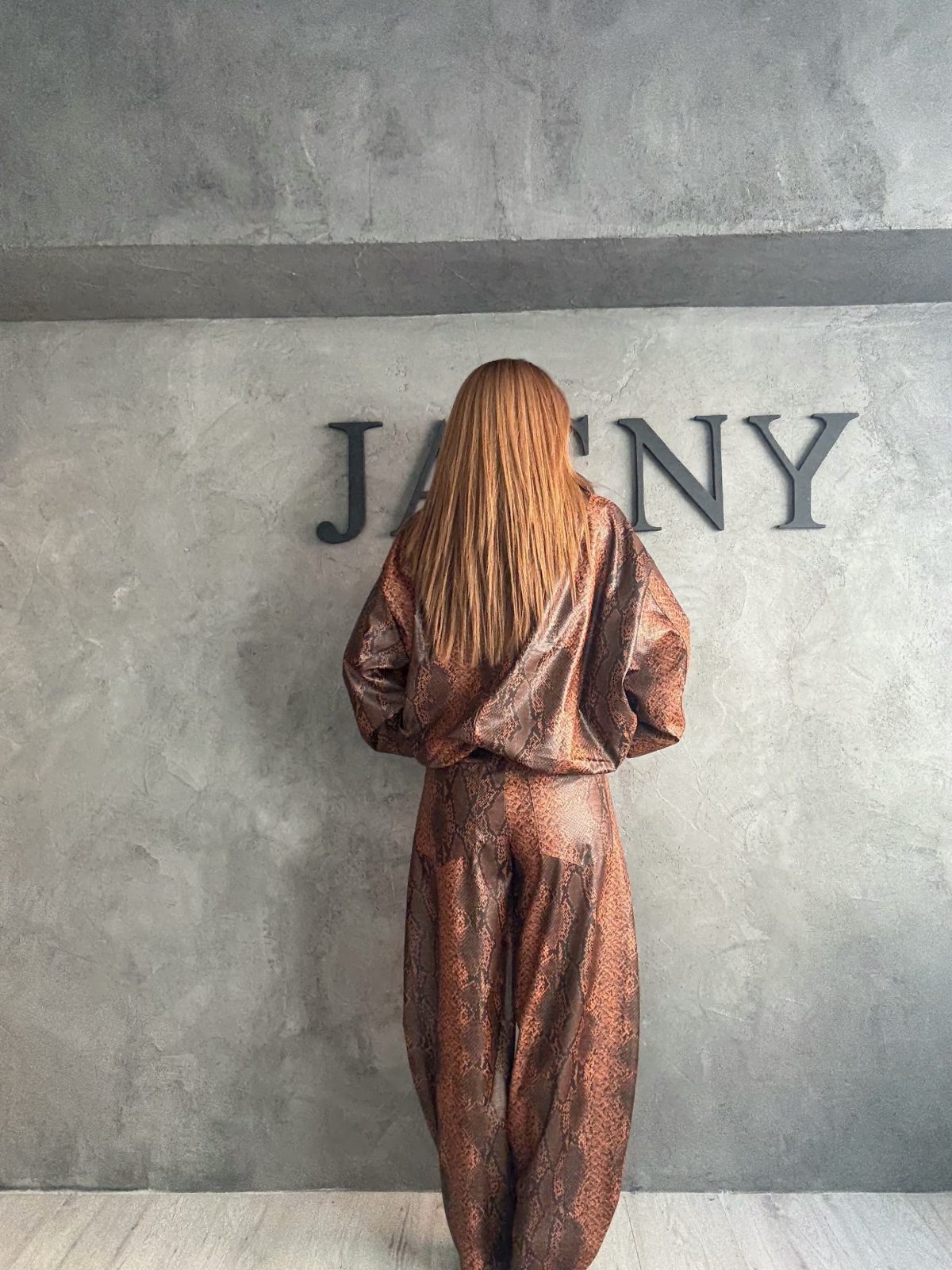 Ένα total look που αποπνέει δυναμισμό και πολυτέλεια μέσα από το statement snake print σε καφέ-χάλκινες αποχρώσεις. Το oversized jacket με φερμουάρ συνδυάζεται με wide-leg παντελόνι, δημιουργώντας μια ενιαία εικόνα που ισορροπεί ανάμεσα στο streetwear και στο high-fashion. Η glossy υφή του υφάσματος χαρίζει αίσθηση premium και ξεχωρίζει σε κάθε περίσταση.