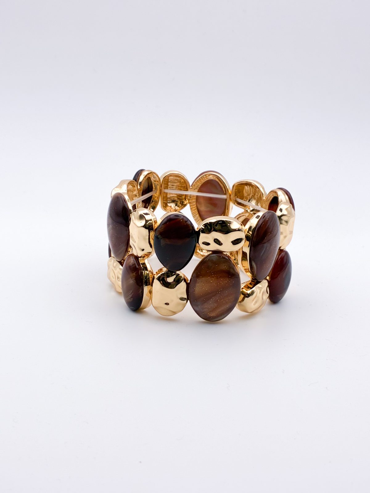 Statement βραχιόλι με γυαλιστερές καφέ πέτρες σε αποχρώσεις του κεχριμπαριού και χρυσές λεπτομέρειες που χαρίζουν πολυτέλεια. Ο φυσικός τόνος της πέτρας δημιουργεί μια αίσθηση ζεστασιάς και κομψότητας, ιδανική για day-to-night εμφανίσεις.