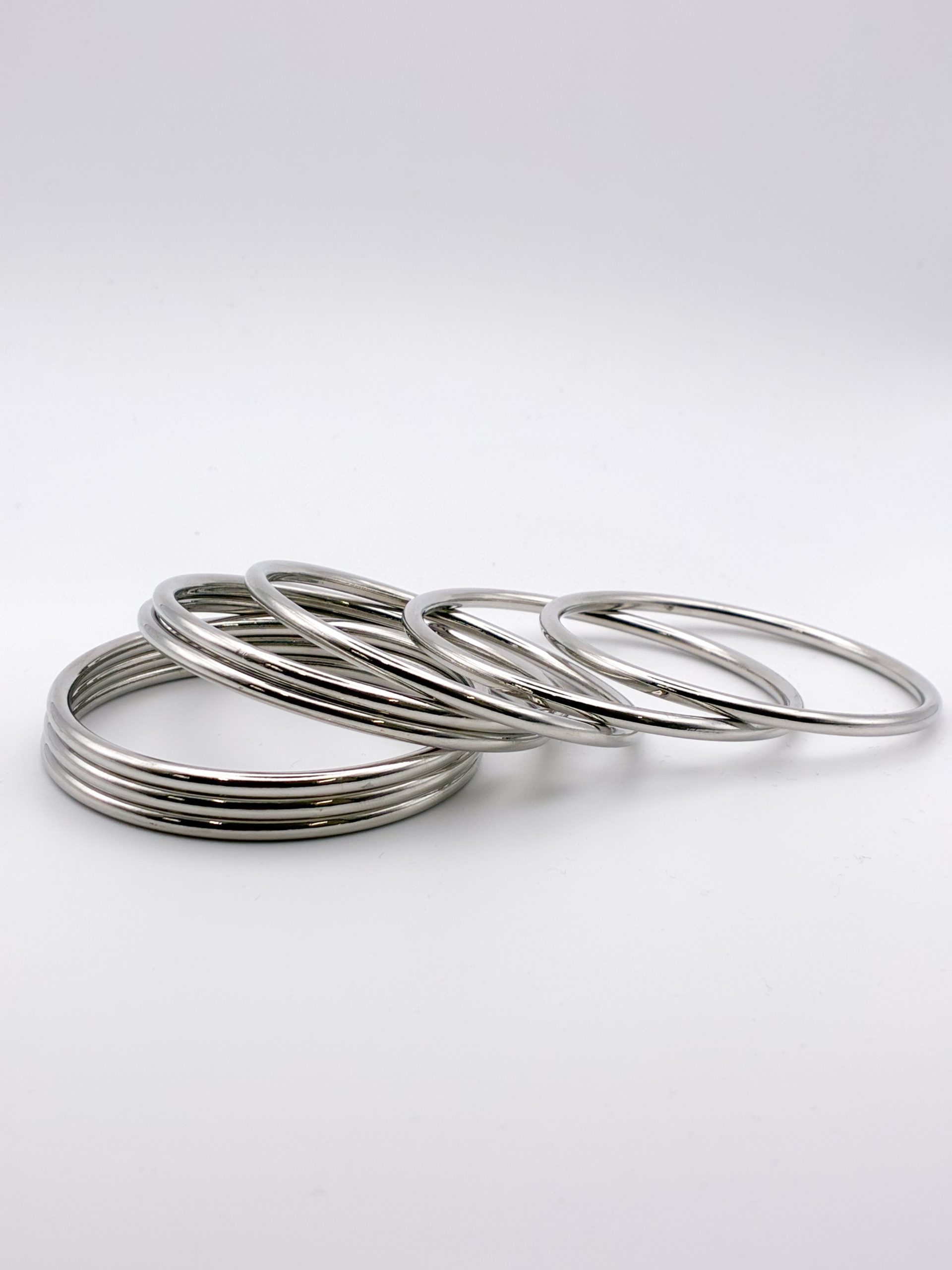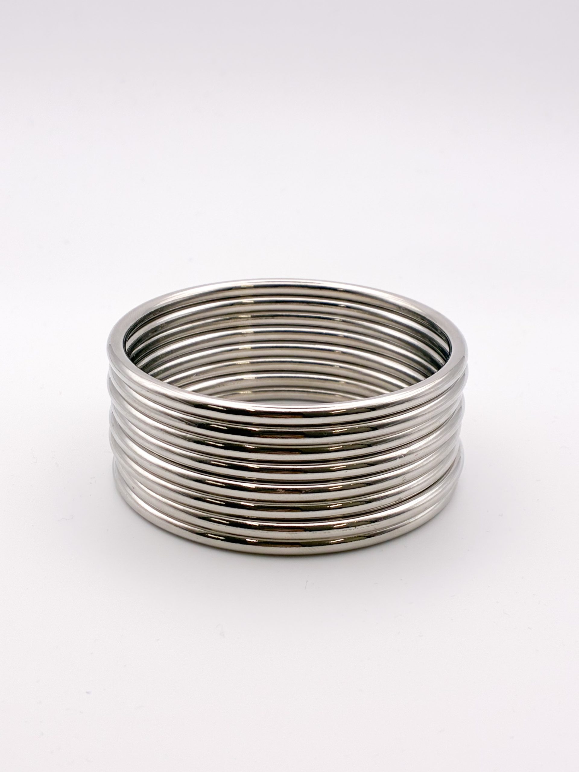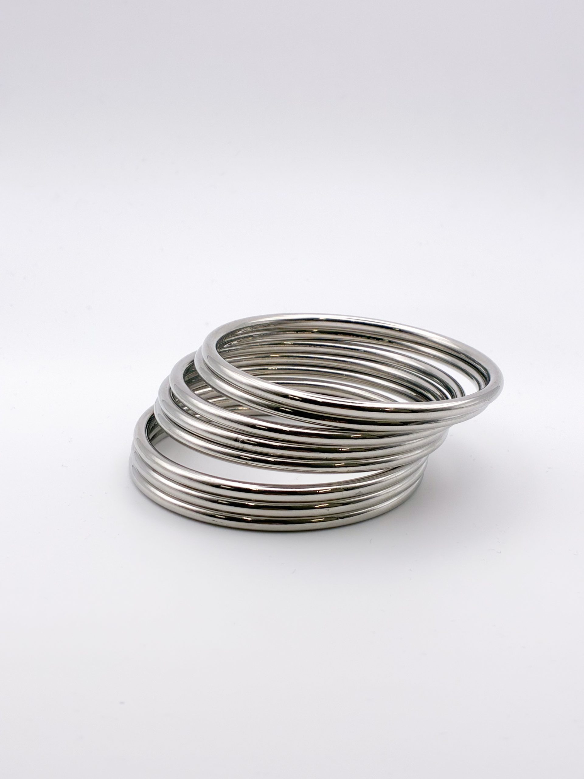 Σετ από πολλαπλά λεπτά ασημένια βραχιόλια με γυαλιστερό φινίρισμα. Η minimal και κομψή σχεδίασή τους προσφέρει διαχρονική φινέτσα και μεγάλη ευελιξία, καθώς μπορούν να φορεθούν τόσο όλα μαζί για πιο statement αποτέλεσμα όσο και μεμονωμένα για μια πιο διακριτική εμφάνιση.