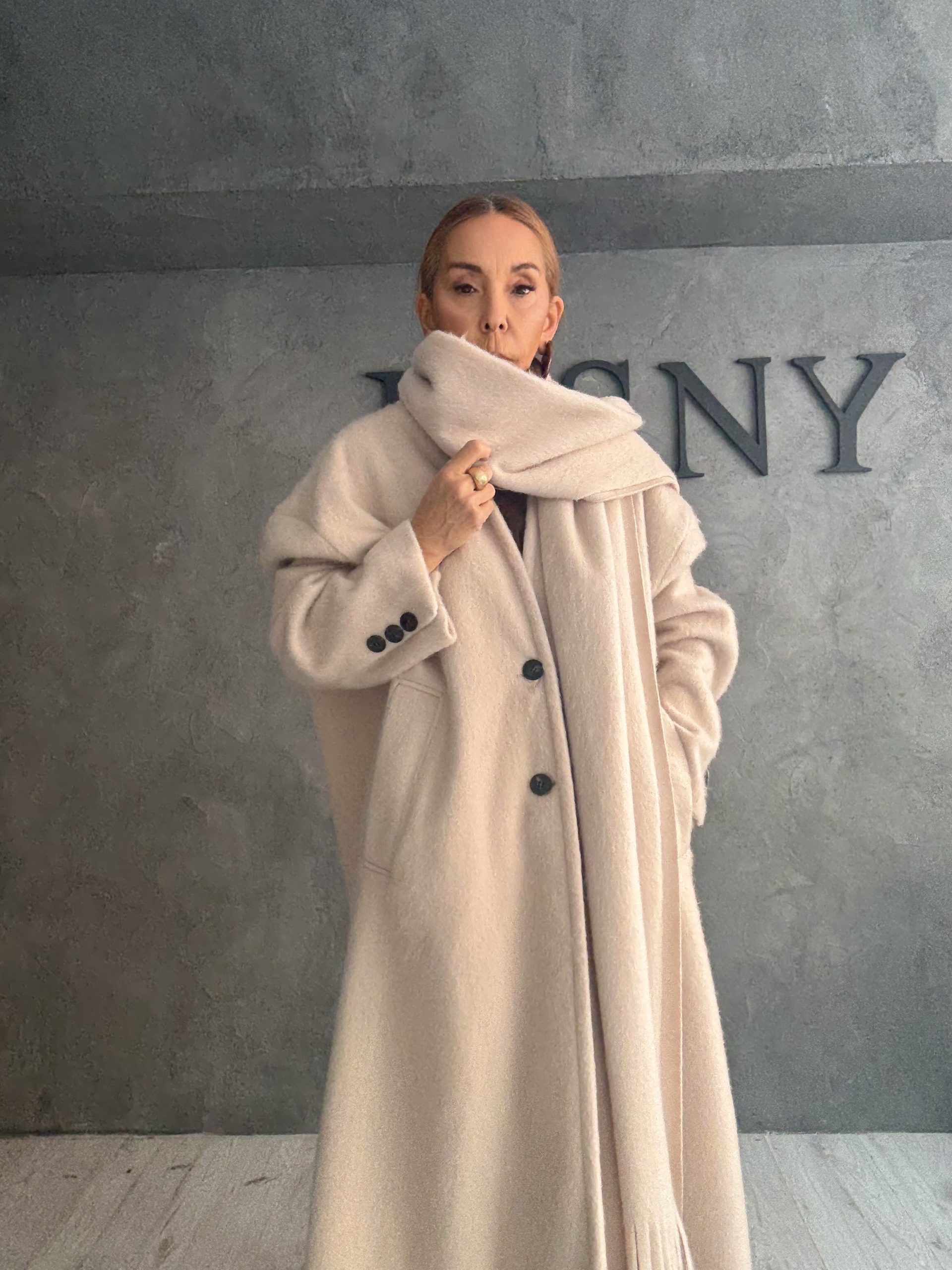 Ένα look που συνδυάζει τη θερμότητα του καφέ με τη γλυκιά καθαρότητα του ανοιχτού beige. Το πλούσιο καφέ ζιβάγκο και το δρματίνη παντελόνι σε espresso τόνο λειτουργούν σαν στιβαρή βάση, ενώ το μαλακό παλτό με τα διακριτικά κρόσσια προσθέτει φως και ρευστότητα. Το αποτέλεσμα είναι ισορροπημένο, ήρεμο και γεμάτο χαρακτήρα — μια σύγχρονη απάντηση στο luxury minimalism.