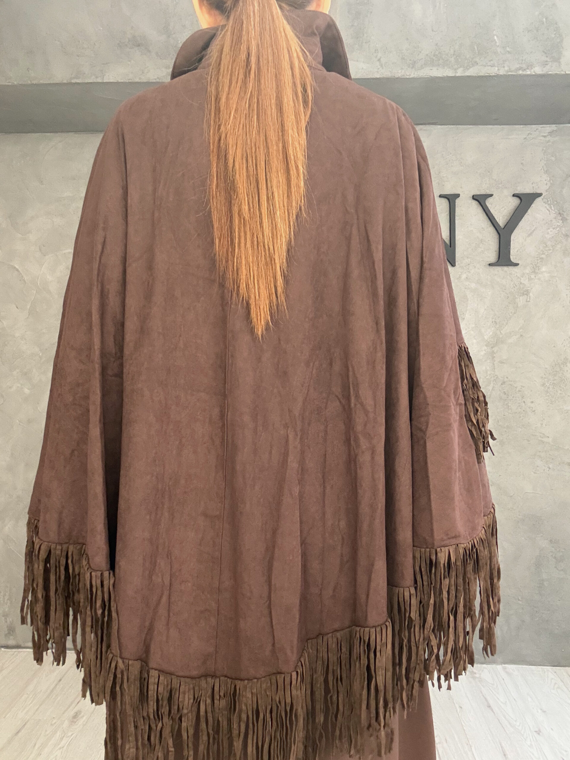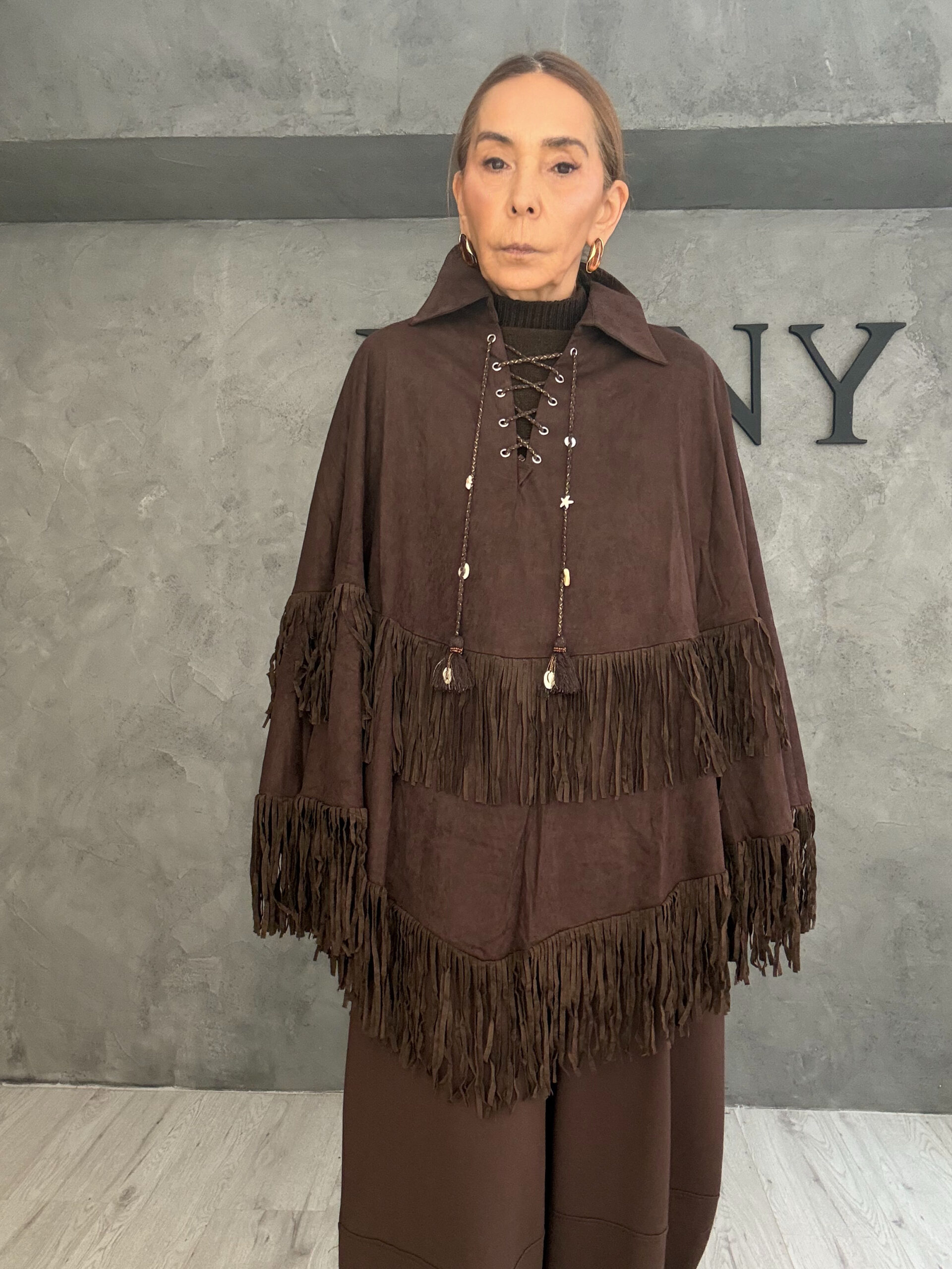 Καφέ πόντσο με suede-look υφή και έντονα κρόσσια που χαρίζουν κίνηση και χαρακτήρα στο σύνολο. Το lace-up δέσιμο στο μπούστο δημιουργεί focal point και προσθέτει μια boho–western αισθητική, ενώ η άνετη γραμμή και το μακρύτερο μήκος επιτρέπουν ευελιξία στο styling. Τα κρόσσια σε διαφορετικά επίπεδα δίνουν βάθος και δυναμική, μετατρέποντας το κομμάτι σε statement χωρίς να χάνει τη φορεσιμότητά του. Ένα ρούχο με έντονη προσωπικότητα, ιδανικό για layered εμφανίσεις.