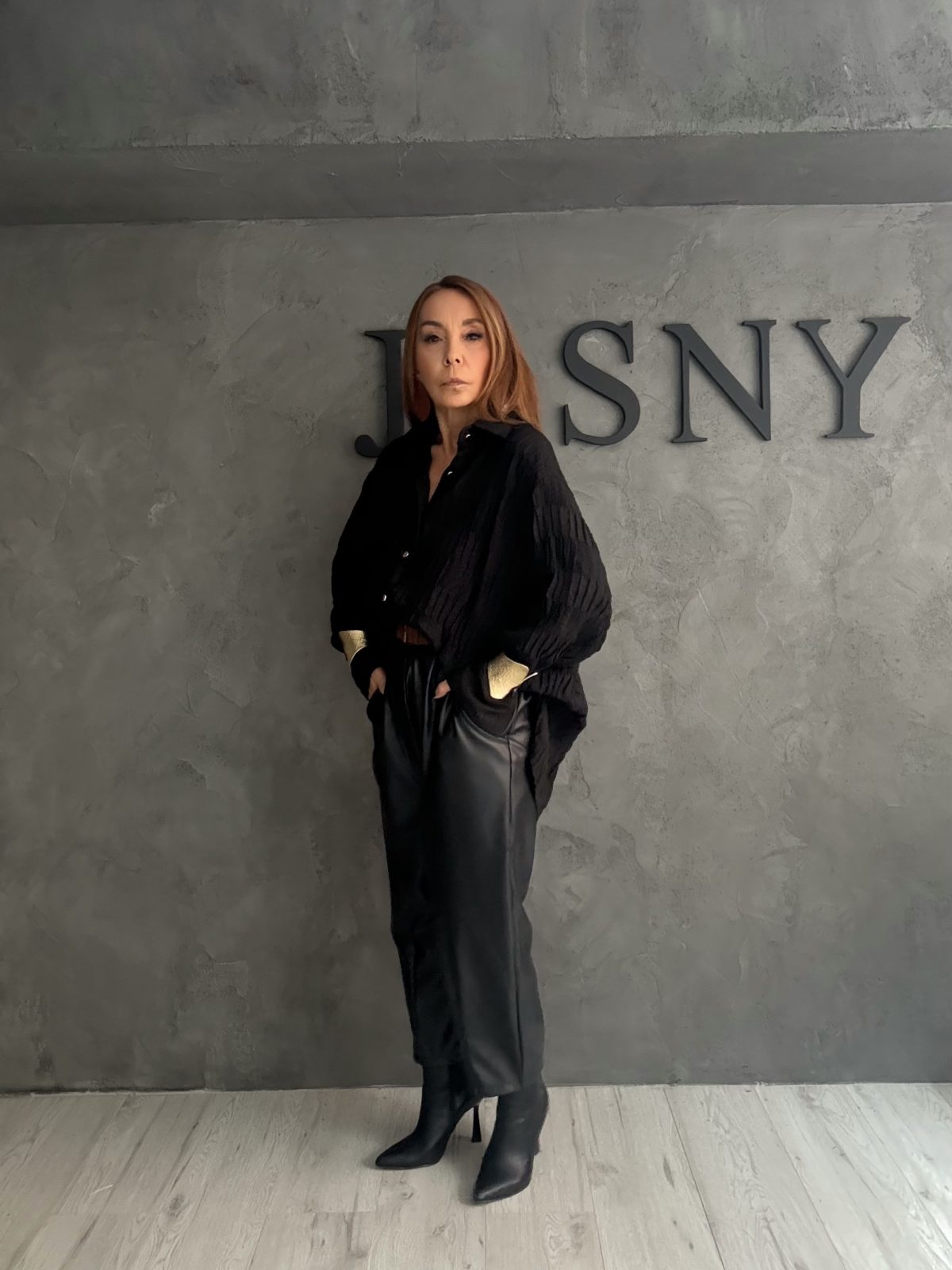 Ένα total black look με δυναμισμό και minimal κομψότητα. Το πουκάμισο με την ιδιαίτερη ανάγλυφη πλισέ υφή συνδυάζεται με eco leather παντελόνι σε χαλαρή γραμμή, δημιουργώντας ισορροπία ανάμεσα στο structured και το fluid. Η καφέ ζώνη στη μέση “σπάει” διακριτικά τη μονοχρωμία, ενώ τα μαύρα ankle boots τονίζουν τη μινιμαλιστική ισχύ του συνόλου. Τα χρυσά μανσέττα–βραχιόλια προσθέτουν μια κομψή λάμψη, δίνοντας luxury αίσθηση.