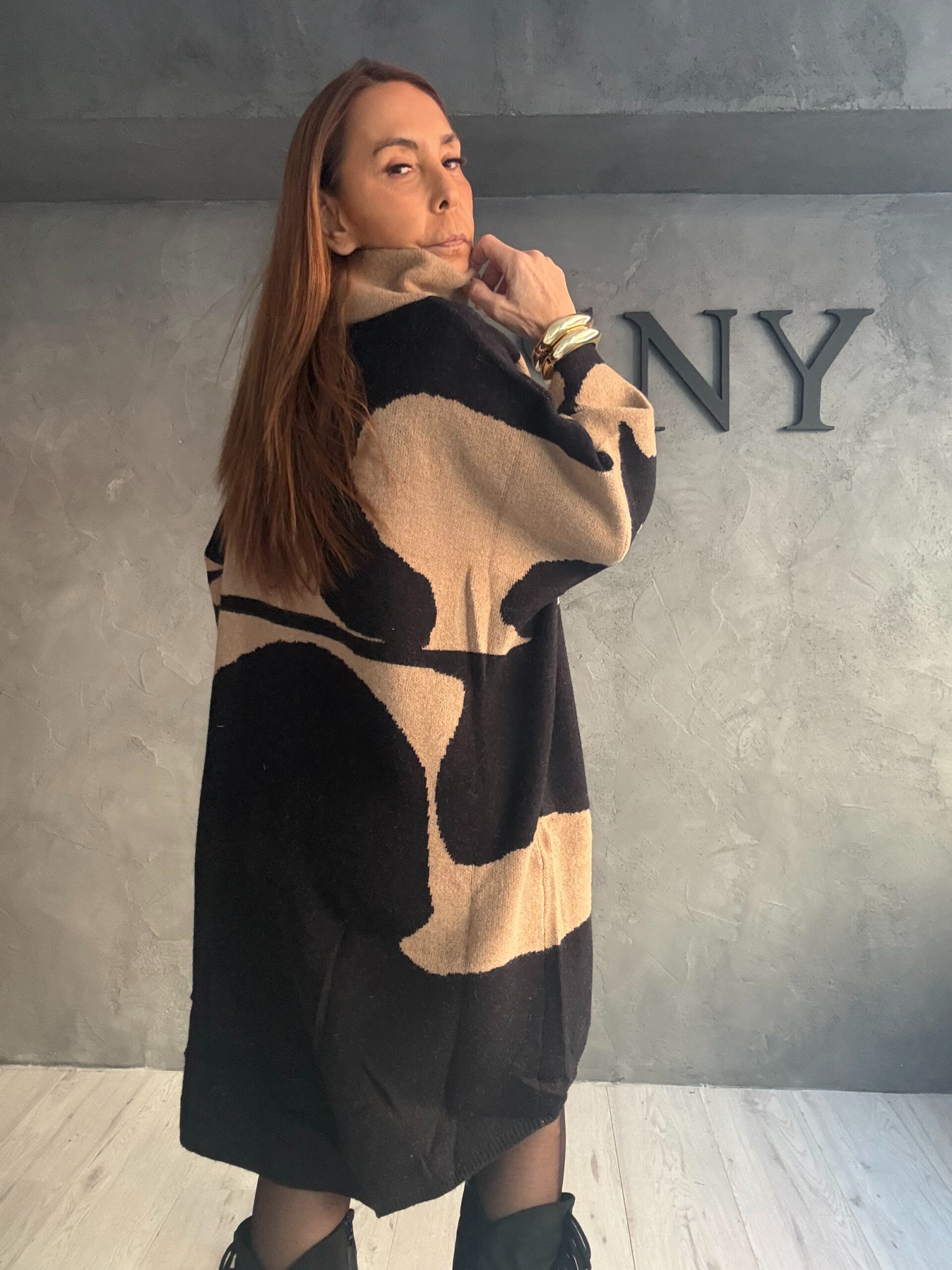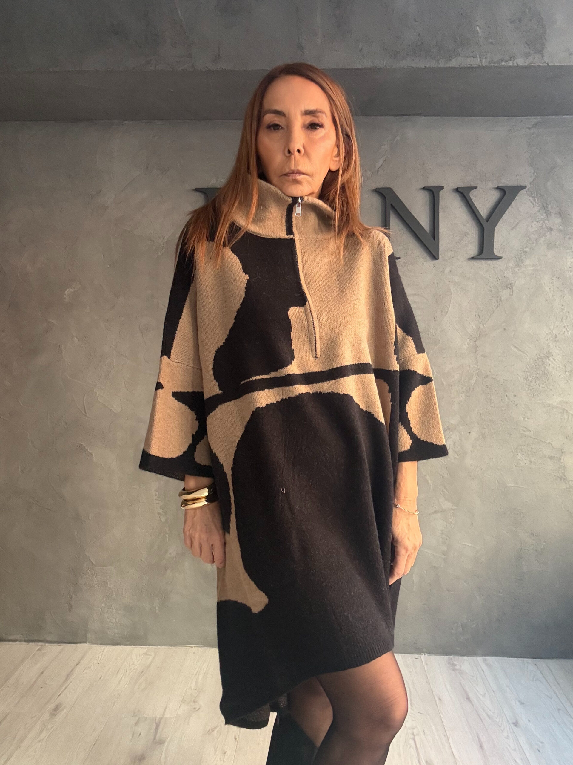 Πλεκτό μπλουζοφόρεμα σε άνετη γραμμή με αφηρημένο μοτίβο σε γήινες αποχρώσεις. Ο όρθιος γιακάς με φερμουάρ προσθέτει σύγχρονο χαρακτήρα, ενώ το μήκος του το καθιστά ιδανικό τόσο για αυτόνομη χρήση όσο και για layering. Ένα κομμάτι που συνδυάζει άνεση και ιδιαίτερη αισθητική, ιδανικό για καθημερινές αλλά και πιο προσεγμένες εμφανίσεις.