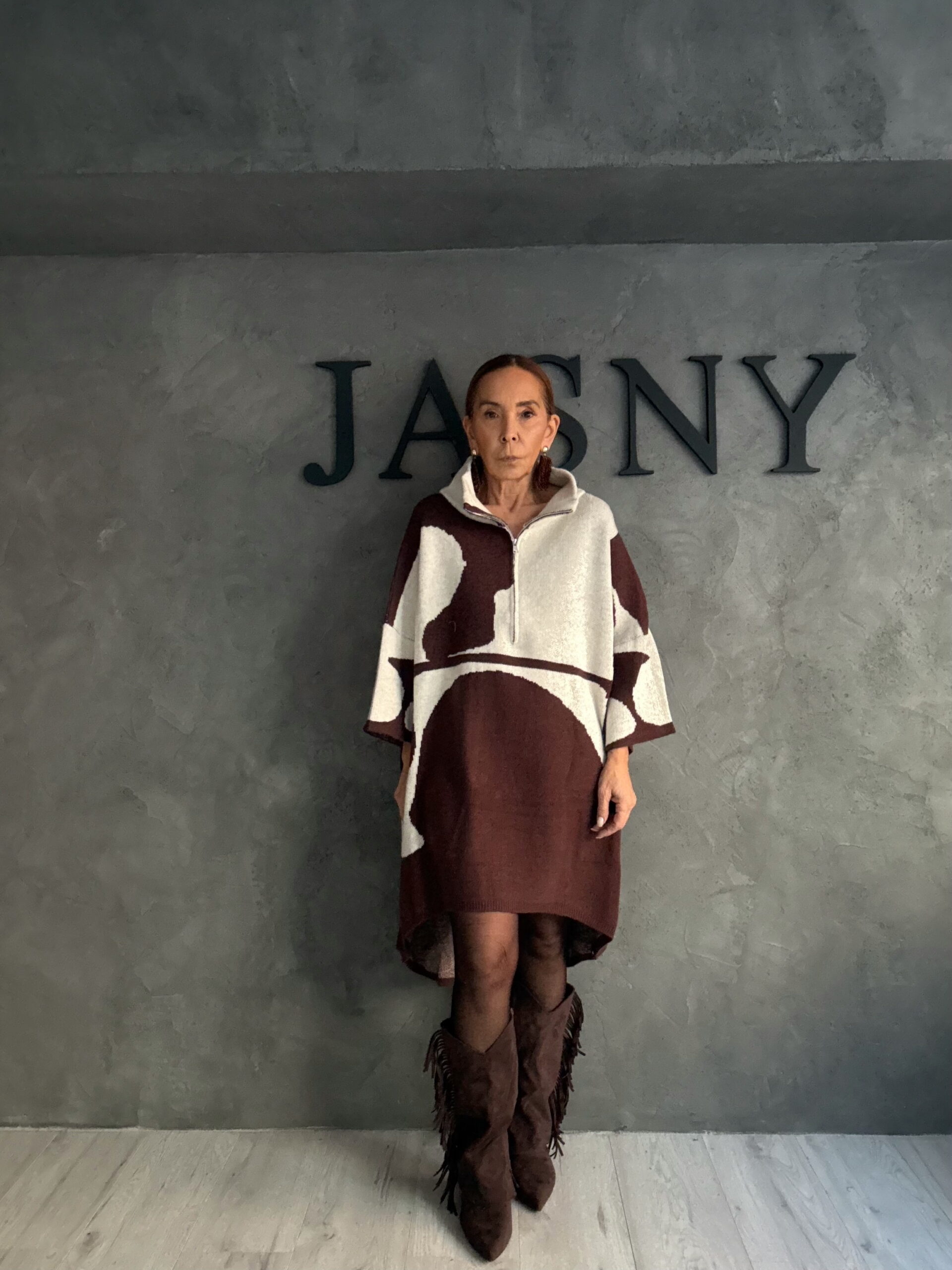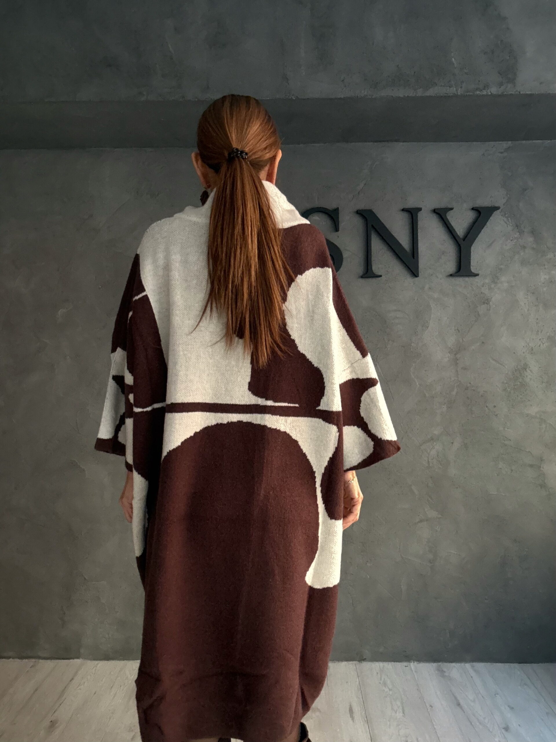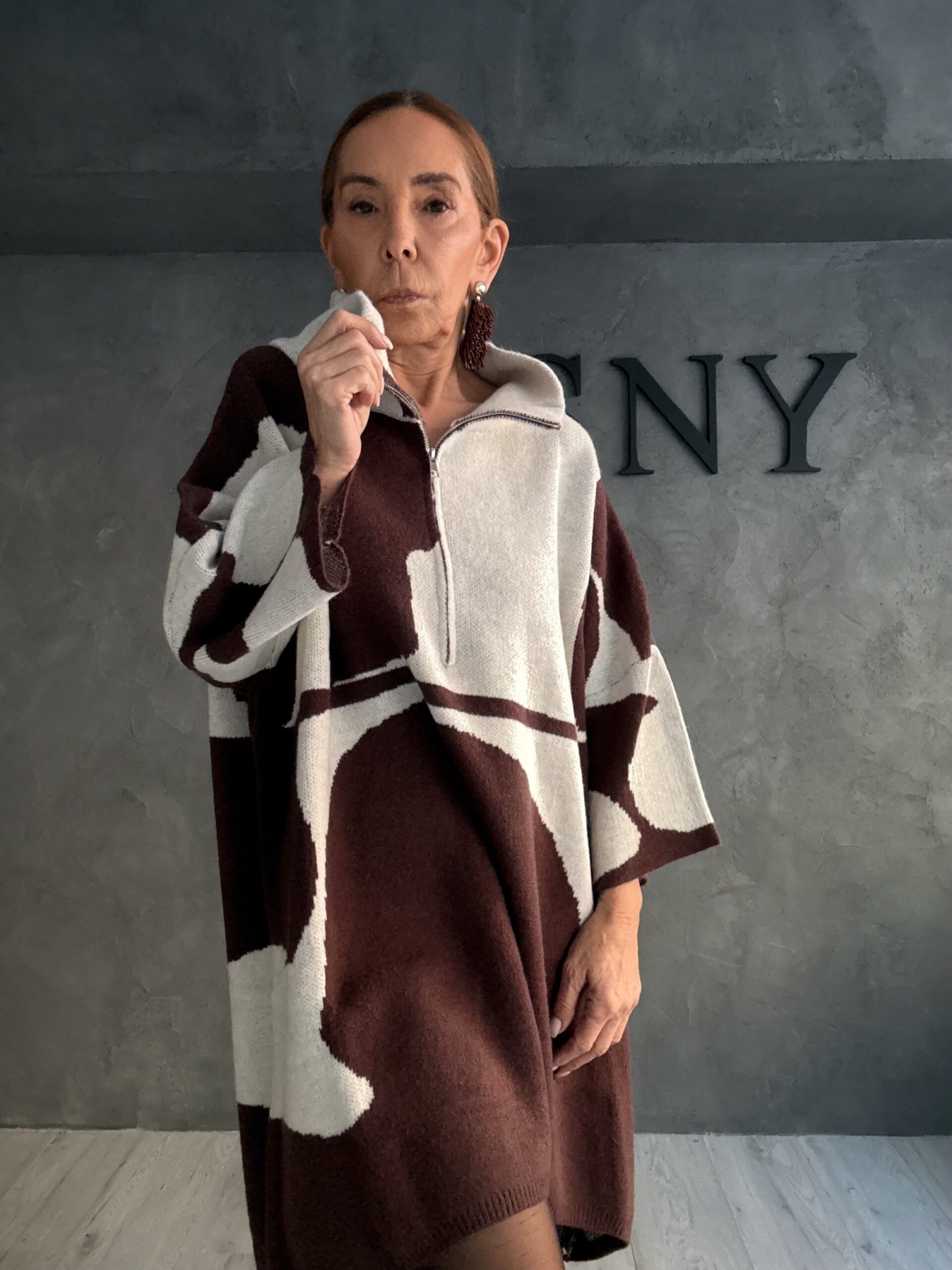 Πλεκτό μπλουζοφόρεμα σε εκρού τόνο που φωτίζει τη σιλουέτα και αναδεικνύει την oversized γραμμή με διακριτικό τρόπο. Το αφηρημένο σχέδιο λειτουργεί σαν ήσυχη αντίθεση πάνω στη φωτεινή βάση, δημιουργώντας ένα σύγχρονο αλλά καθαρό αποτέλεσμα.